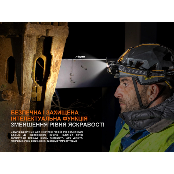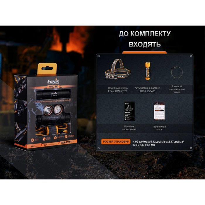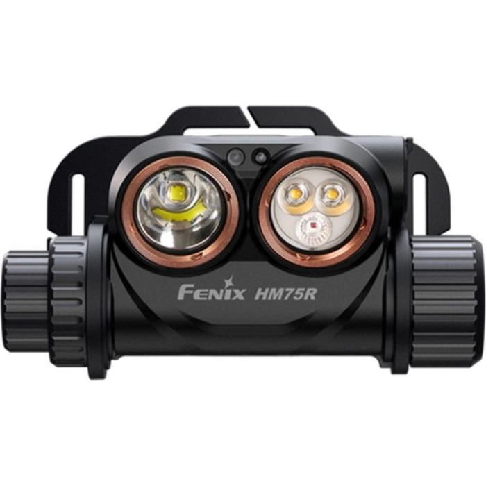 Модель Fenix HM75R SE упрощена версией фонаря Fenix HM75R. Она имеет ту же функциональность с широким набором режимов, но поставляется в комплекте с 1 аккумулятором вместо нескольких. Это позволяет приобрести один из самых инновационных фонарей в ассортименте Fenix по более доступной цене (при необходимости можно приобрести дополнительный аккумулятор отдельно). светодиоды: 1 х Luminus SST40 (6500К), 2 х Luminus SST20 (4000К) и 1х OSRAM GR QSSPA1.23 (красный) Они находятся под сверхпрочными линзами из японского пластика PC-1250Z. К ключевым особенностям модели относится интеллектуальная система снижения яркости света. мгновенное снижение яркости при приближении фонаря к освещаемому предмету ближе чем на 60 мм Таким образом можно избежать возгорания технических жидкостей и других воспламеняющихся веществ при действии мощного луча, а также предотвратить негативное влияние освещения на зрение человека.