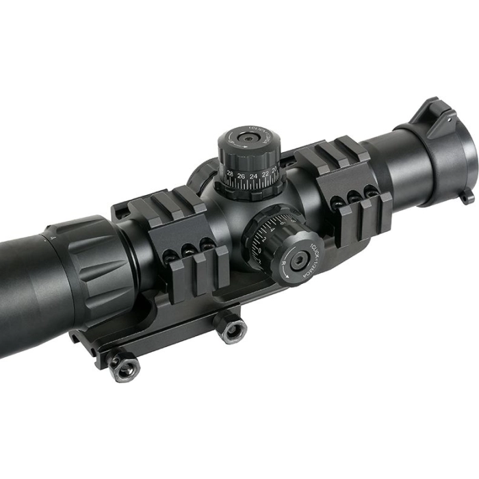Увеличение – 1-4х. Диаметр объектива составляет 30 миллиметров. Поле зрения – 105,8-26,2 фута на 100 Yds. Диаметр выходного зрачка - 11,0-5,0 мм.