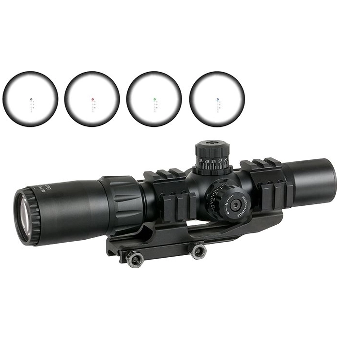 Прицел Mustang Gen.2 1-4X30 SFP имеет трехуровневую систему подсветки: красный, зеленый и синий свет. В качестве источника питания используется батарейка типа CR2032. Прицел крепится с помощью планки Пикатинни. В комплект входят защитные крышки для оптики и моноблок