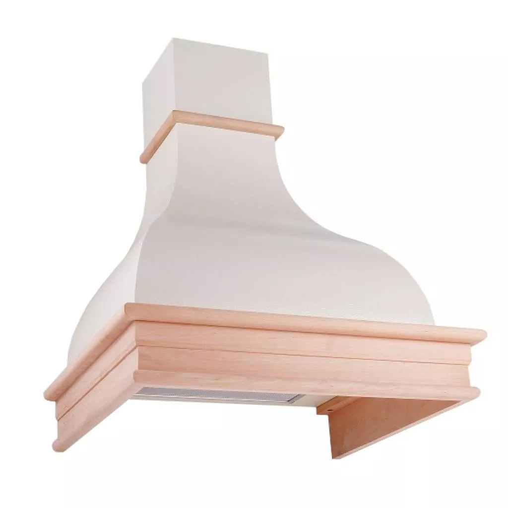 . Цвет корпуса - слоновая кость, деревянная неокрашенная окантовка может быть окрашена вами под цвет кухни или каких-то ее отдельных элементов. Эта вытяжка - не просто необходимая бытовая техника, это - элемент декора. Вытяжка станет особой изюминкой в интерьере вашей кухни. Кроме того, на ее выступающей части (окантовка) вы можете разместить какие-то декоративные украшения. Тем самым придав кухне еще больше особенности.
