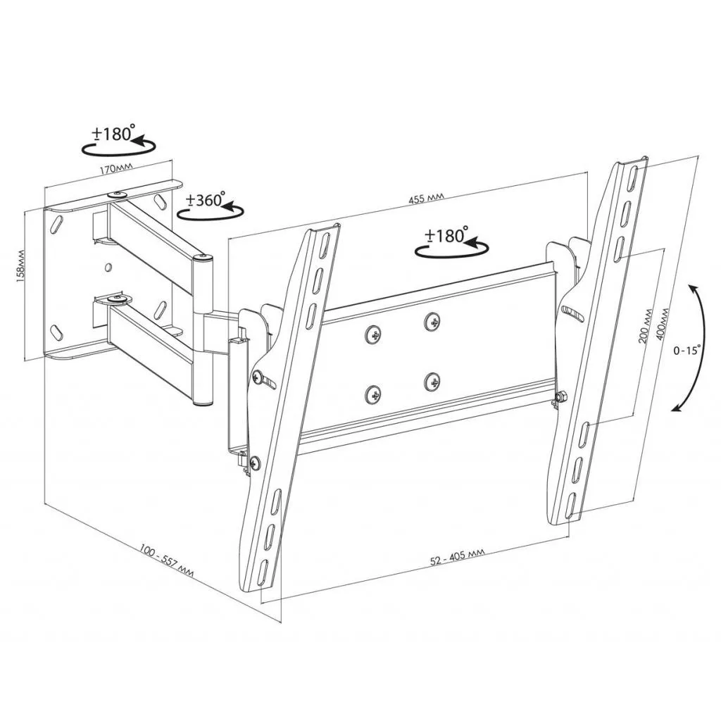 имеет 3 регулируемых узла поворота по горизонтали: 180°/360°/180°. Весит данное изделие приблизительно 5,82 кг.