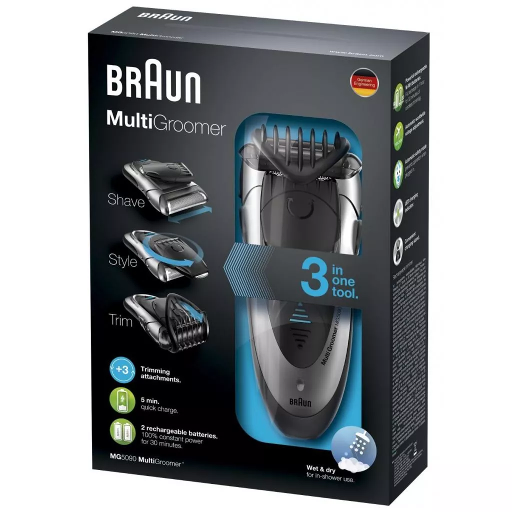 Этот прибор предоставит возможность без проблем моделировать растительность на лице, даже если вы новичок в этом деле. Выдвижной триммер можно установить в двух положениях: его широкая сторона отвечает за бритье больших участков щетины, а узкая точно и четко очерчивает контуры вашей бородки. Корпус мультигрумера Braun MG 5090 водонепроницаемым, поэтому вы без проблем можете воспользоваться им во время водных процедур. В комплекте есть маленькая щетка для чистки от волосков. Цена мультигрумера Braun MG 5090 соответствует его качеству, такая покупка вас приятно удивит.