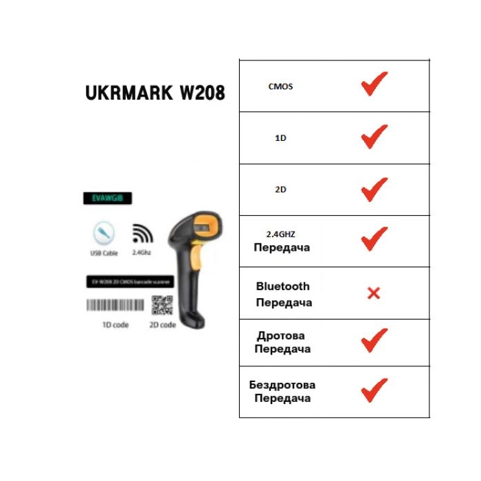 1D, 2D, QR сканер штрих-кодов UKRMARK EV-W208, CMOS, проводной USB/беспроводной 2.4GHz