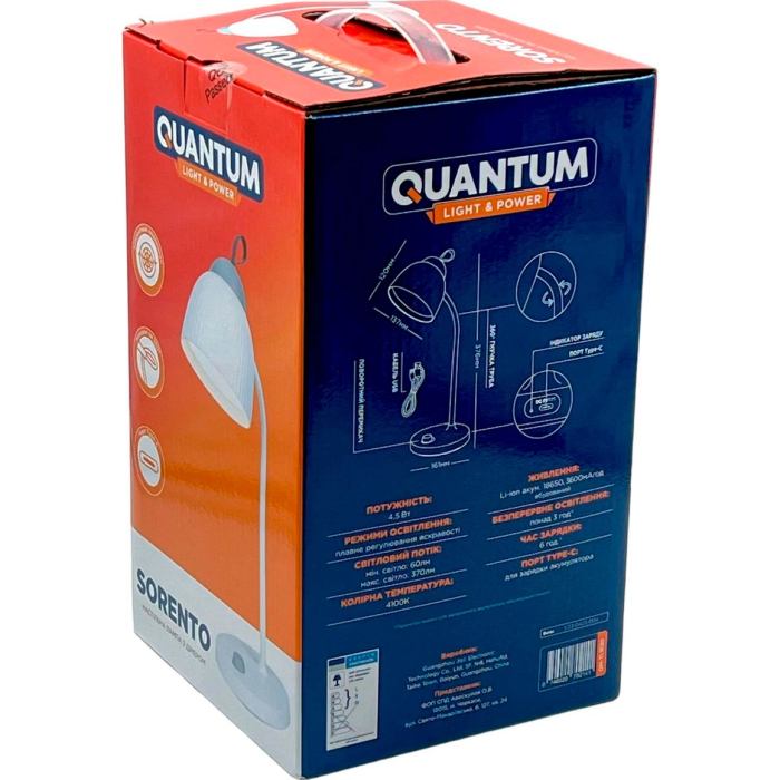 Настольная лампа Quantum QM -1020 SORENTO имеет современный внешний вид, оснащен и укомплектована гибкой стойкой, позволяющей выбрать необходимый угол освещения. Изделие оснащено и укомплектовано поворотным переключателем для включения света и плавной регулировки яркости, что поможет применить лампу к разным потребностям. Лампа питается встроенным литий-ионным аккумулятором 18650 и обеспечивает отличное освещение. В лампе используются 48 светодиодов SMD, энергосберегающих, имеющих высокую яркость и длительный срок службы. QM-TL1020 SORENTO оснащен и укомплектована индикатором заряда аккумулятора – во время зарядки горит красный свет, а когда полностью заряжен – горит зеленый свет. Имеется сенсорная кнопка управления и обычный выключатель. Изделие оснащено и укомплектовано входным портом Type-C.
