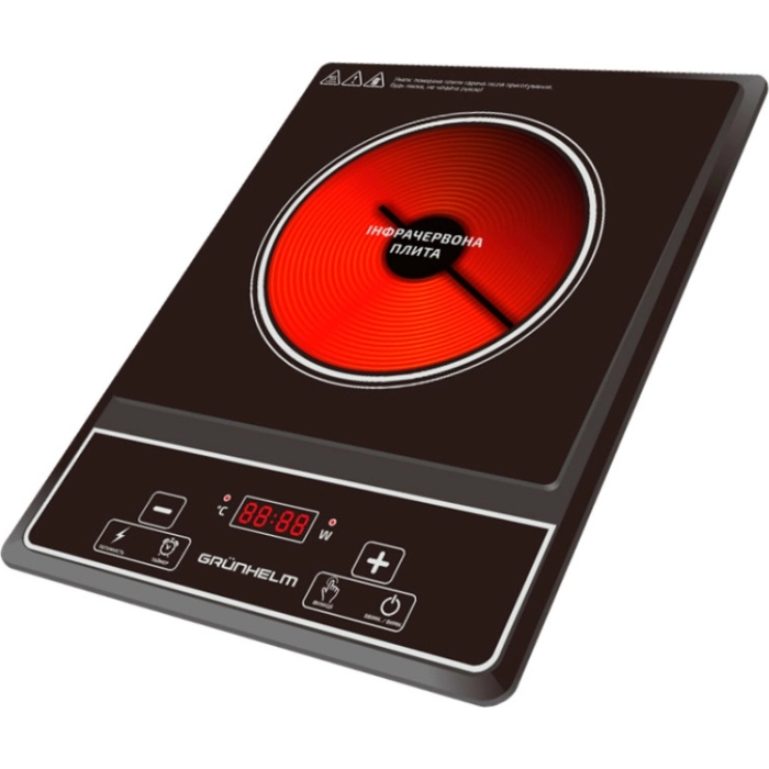Современная настольная плита инфракрасная Grunhelm GIR -809 на 1 конфорку с сенсорным управлением. Поверхность — пластина Black Crystal, модель имеет 8 температурных режимов, 8 уровней мощности и 5 автоматических приложений