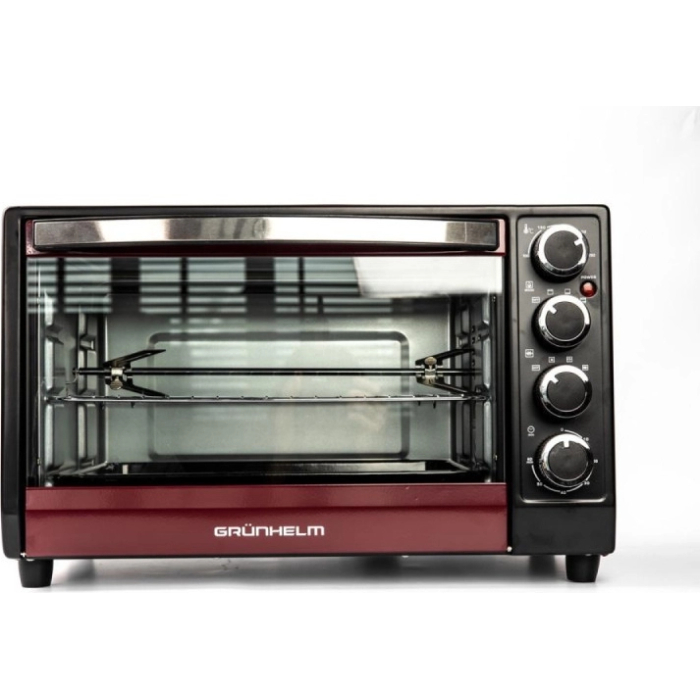 Настольная электрическая печь Grunhelm GN351ARC выполнена в корпусе бордового цвета с черными деталями, хромированной ручкой и такими же хромированными вставками в переключателях. Мощность устройства составляет 1800 Вт, а степень нагрева устанавливается плавной регулировкой. В 35-литровой камере модели установлены гриль, вертел и конвекционный вентилятор. Функция гриль образует на продуктах хрустящую ароматную корочку. Вращающийся вертел с закрепленным на нем большим куском мяса или птицы позволит хорошо прожарить его со всех сторон.