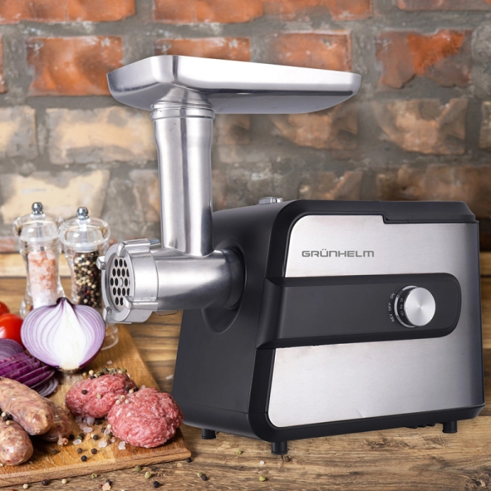 Мясорубка Grunhelm AMG200SS - это современное и функциональное устройство, которое должно находиться на оснащении и укомплектовании любой кухни. Благодаря 3 решеткам с отверстиями разного диаметра измельчит не только мясо, но и другие продукты питания. Мясорубка оснащена и укомплектована двигателем мощностью 2000 Вт, что обеспечивает быстрое и эффективное измельчение продуктов. Более того, с помощью дополнительных аксессуаров, имеющихся в комплекте, мясорубка пригодится для измельчения овощей или приготовления колбасок и кеббе.