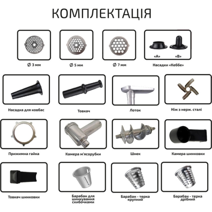 | Диски для фарша | 3 шт (диаметр отверстий 3мм, 5мм, 7мм |