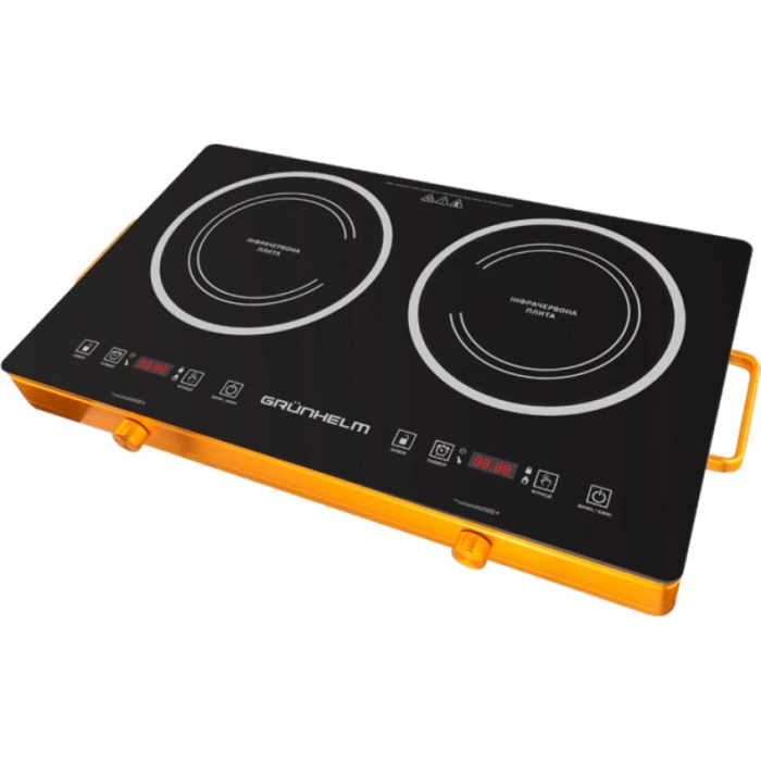 Плита инфракрасная со стеклокерамической панелью для быстрого разогрева, приготовления разнообразных блюд. 2 конфорки, сенсорное управление, 2 ЖК дисплея, что, безусловно, удобно в ходе работы.