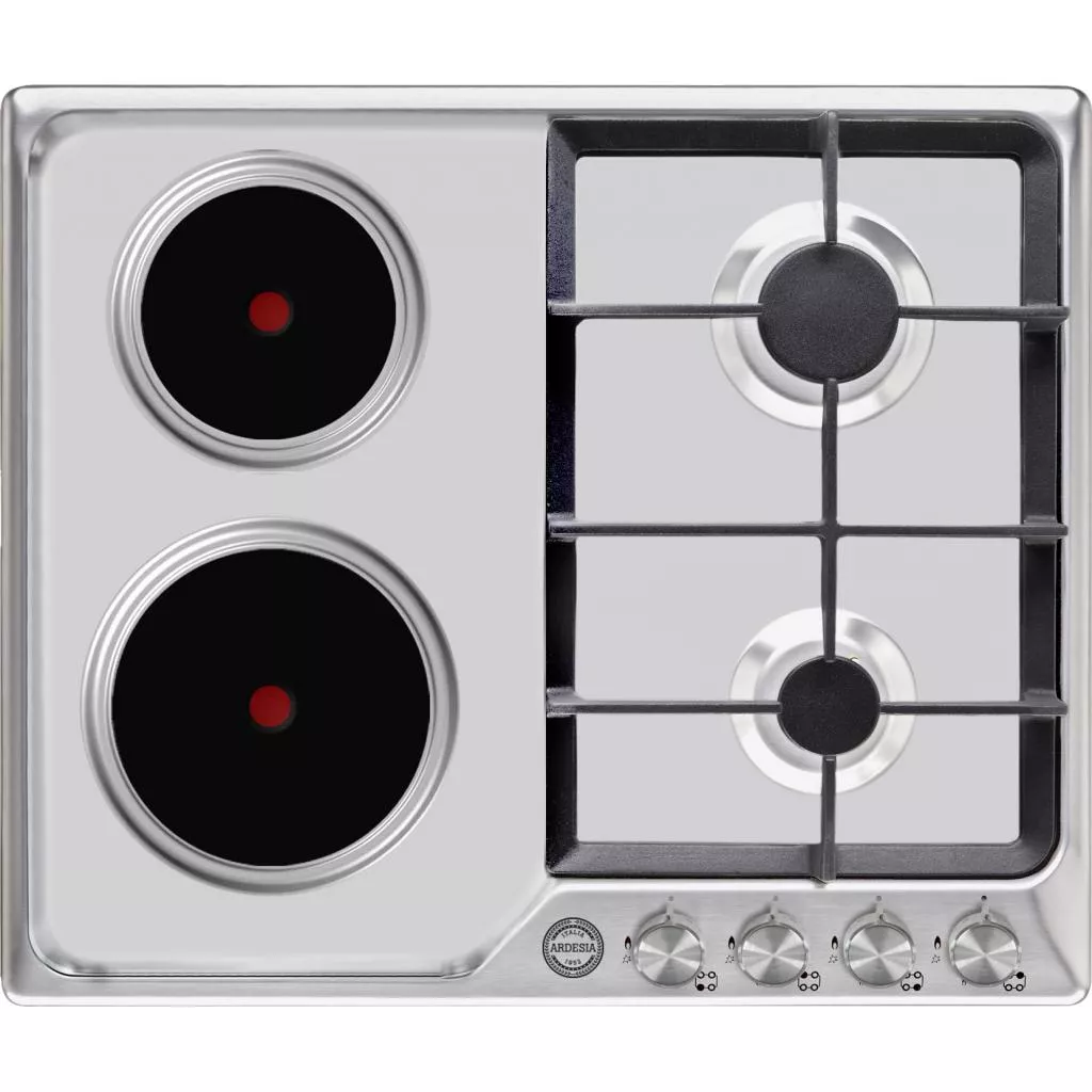 Материал панели конфорок - нержавеющая сталь. 2 электрических и 2 газовых конфорки имеют классическоерасположение, но оно продумано так, чтобы удобно разместить посуду на поверхности. Оснащена варочная поверхность конфорками вспомогательная конфорка, конфорка средней мощности, конфорка быстрого разогрева, мощная конфорка. Чугунные решетки наилучшим образом гармонируют с внешним видом поверхности. Переключатели располагаются на передней панели техники/справа от пользователя.