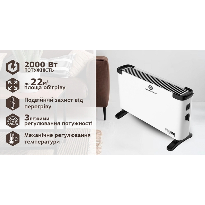 Конвектор PRIME Technics PCH 2032 WL способен обогреть помещение площадью 22 кв. м. и является экономичным источником тепла. Устройство этого типа оснащено и укомплектовано игольчатым нагревательным элементом, что обеспечивает бесшумную работу и безопасную температуру поверхности конвектора. Для удобства управления прибором на корпусе установлен регулятор, которым можно установить 3 режима обогрева.