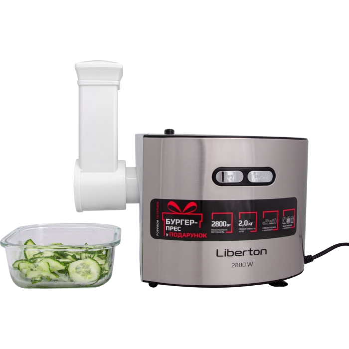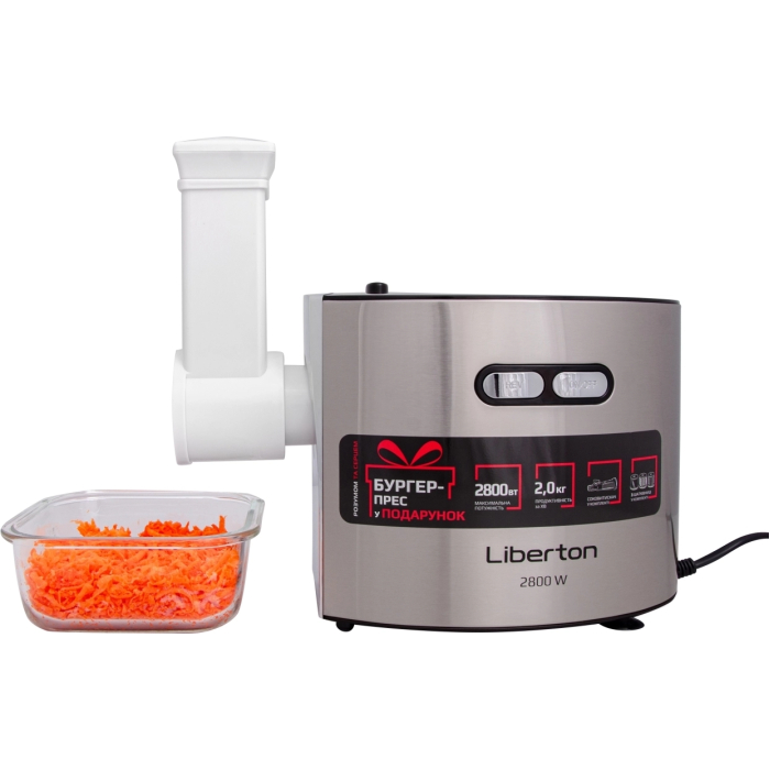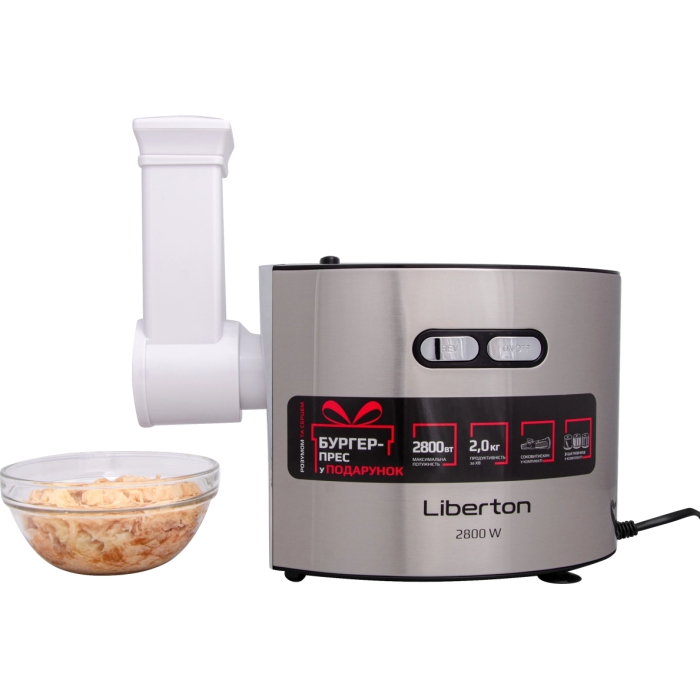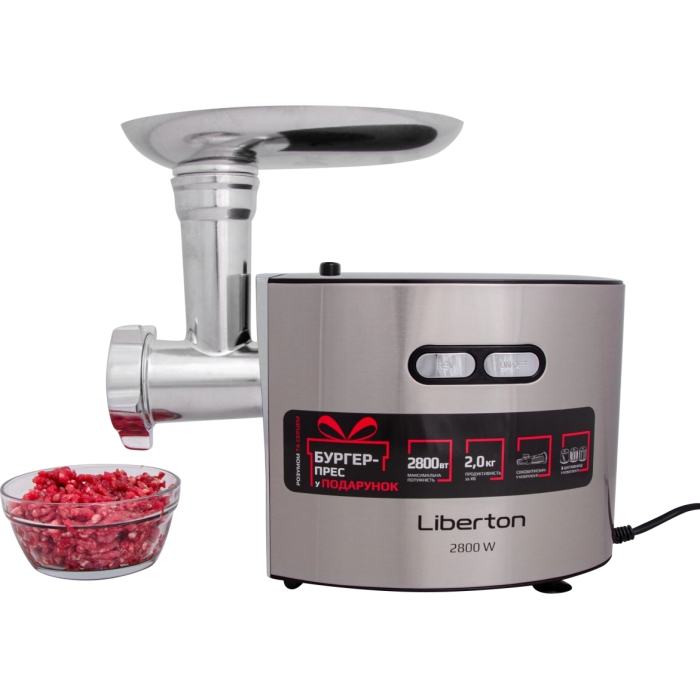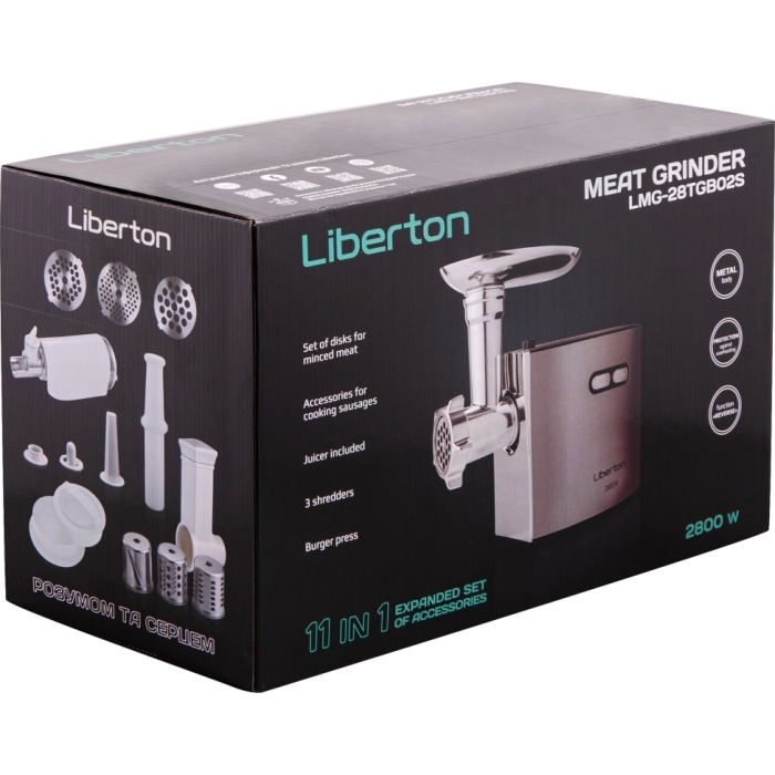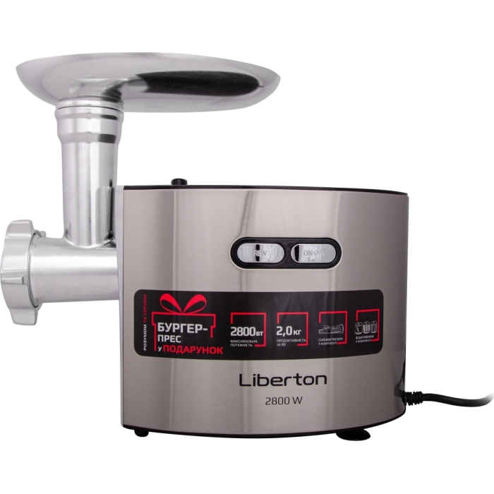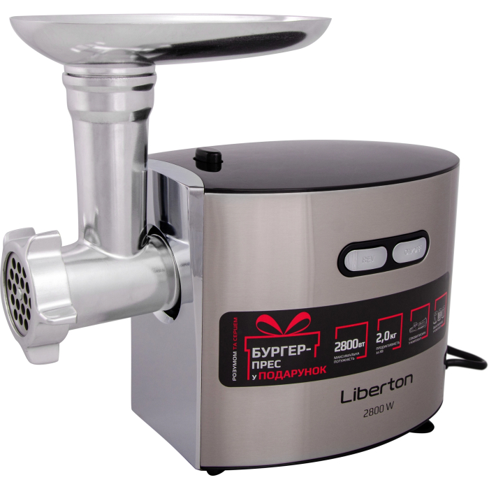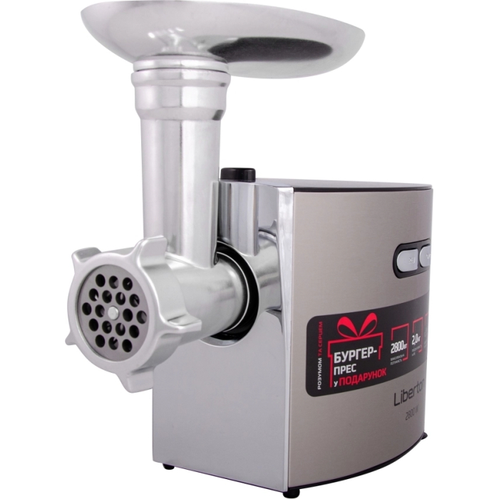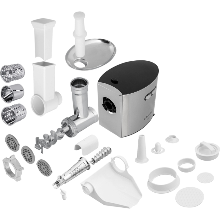 Мощность: 2800 Вт (при заклинивании); Производительность: 2 кг/мин; Функции: реверс, защита от перегрева; Аксессуары: 3 диска для помола (3 мм/5 мм/7 мм), 3 барабана для терки и шинковки, насадка для колбас, насадка для кебе, соковыжималка для томатов, бургер-пресс, толкатель, металлический лоток; Материал шнека: нержавеющая сталь; Материал корпуса: нержавеющая сталь.