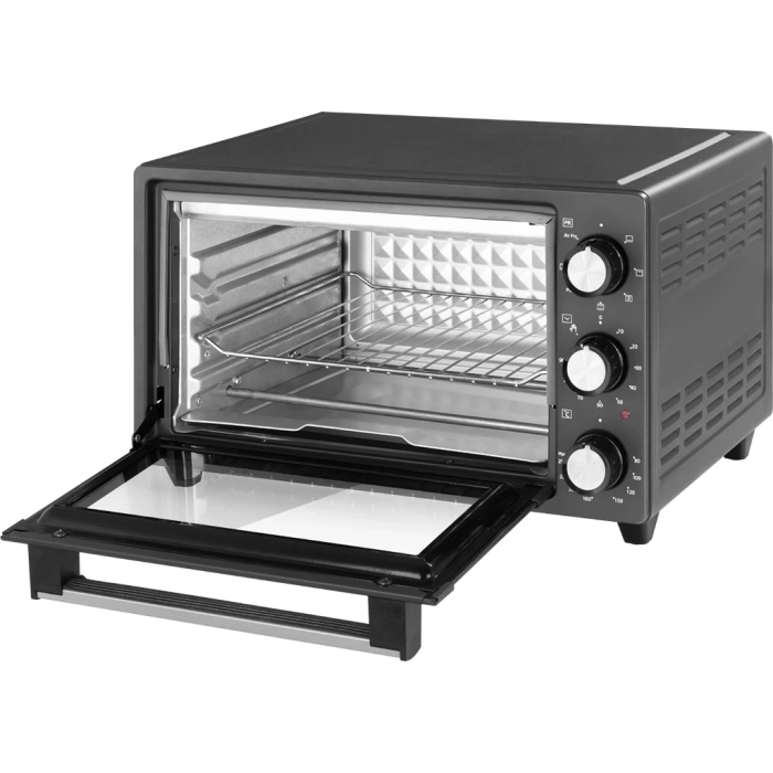 Электрическая духовка, с аэрофритюрницей, мощность 1500 Вт, об - 20 л, механическое управление, термостат 80-250°С, таймер 90 мин, гриль, 7 функций приготовления, подсветка камеры, оцинкованное внутреннее покрытие, двери с двойным стеклом.