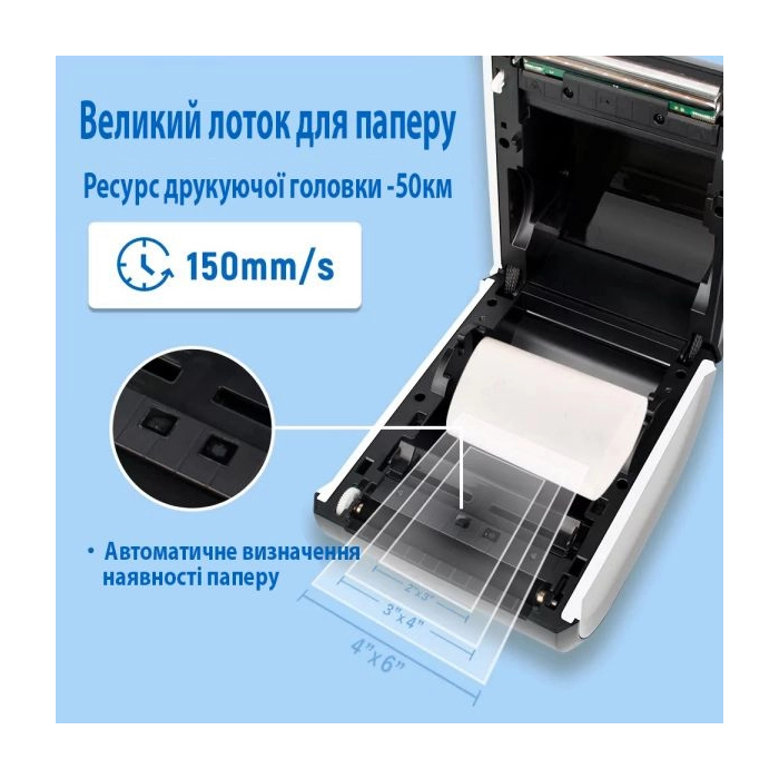 Экономия времени: принтер этикеток UKRMARK D520BT имеет скорость печати 150 мм/с и большой лоток для бумаги, который вмещает рулон до 500 этикеток 4&6 дюйм. /p>