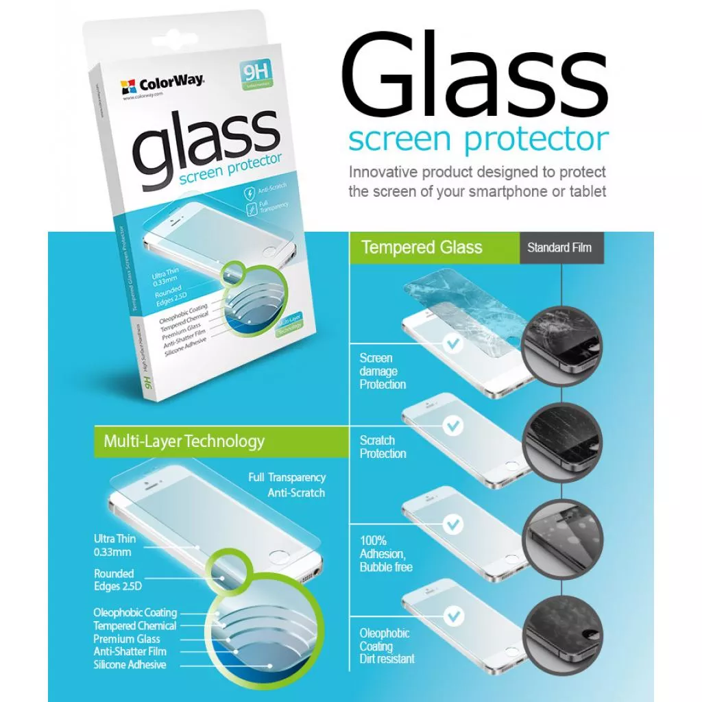 Защитное стекло ColorWay – это многослойное закаленное стекло, толщиной 0,33 мм и твердостью 9H. Произведено под конкретную модель смартфона с учетом всех его конструктивных особенностей.