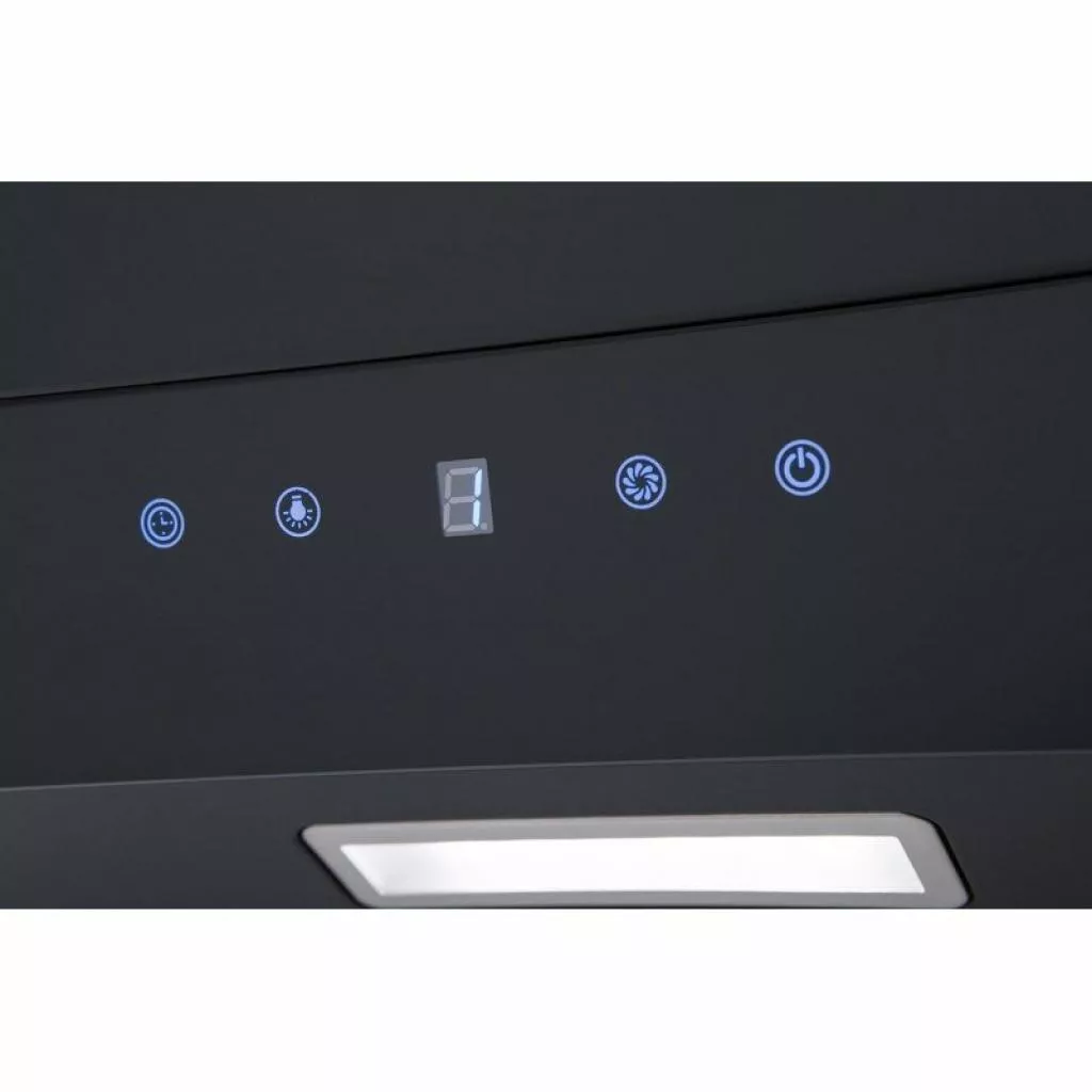 Вытяжка сделана из черного стекла и снабжена удобным управлением в виде сенсора на стекле.
