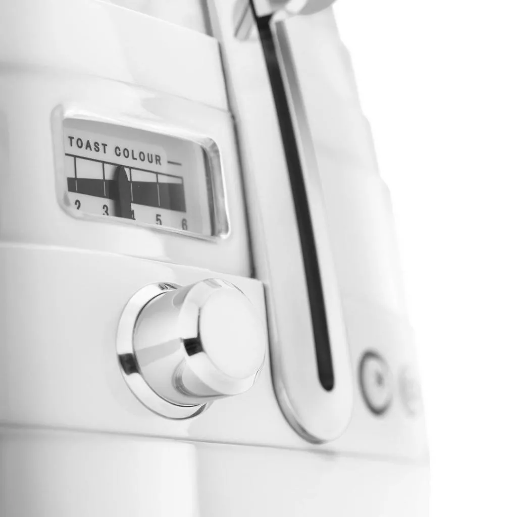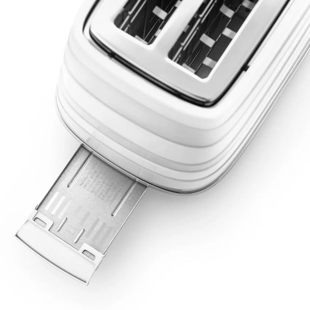 Красивый белоснежный цвет, асимметрические линии, хром и пластик – такой тостер уж точно можно назвать заметным.