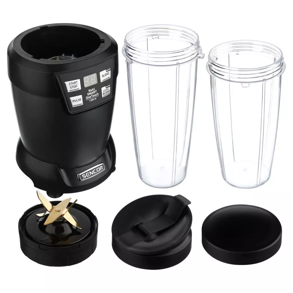 Он оборудован ножевым устройством с четырьмя лезвиями из качественной нержавеющей стали и чашами для размешивания двух размеров. Чаши изготовлены из качественной прочной пластмассы, которая не содержит вредный углеводород и одновременно они могут использоваться в качестве практичных бутылок для питья. Обе бутылки можно закрыть крышкой с носиком для питья или без него для удобного обращения без разлития напитка. Не скользящие ножки обеспечивают отличную устойчивость блендера во время работы. Бутылки, крышки и ножевое устройство можно безопасно мыть в посудомоечной машине.
