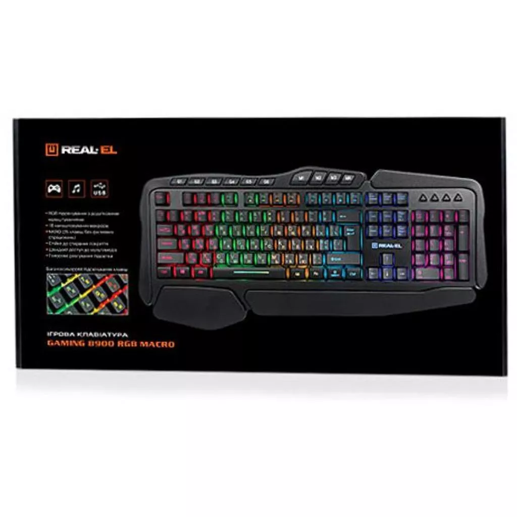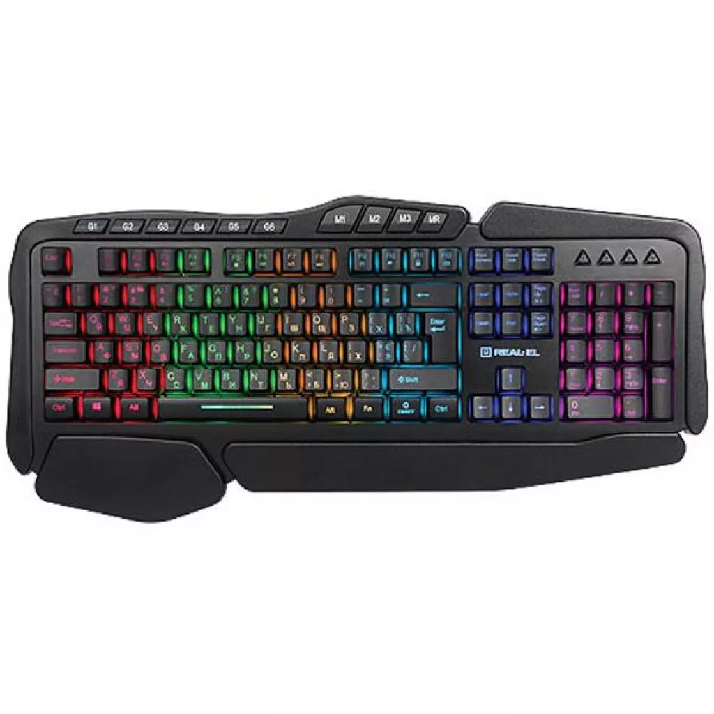 Особенностью игровой клавиатуры REAL-EL Gaming 8900 RGB Macro являются: эргономичный игровой дизайн, 18 настраиваемых макросов, NKRO (26 клавиш без фиктивных срабатываний), звуковое реагирования подсветки, 12 Fn кнопок быстрого доступа к Windows, Интернету и Мультимедиа.