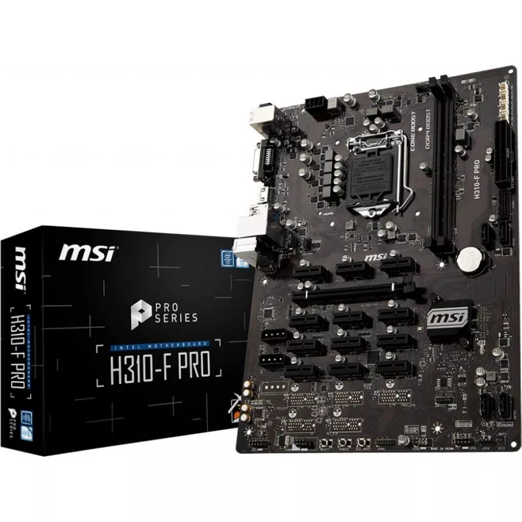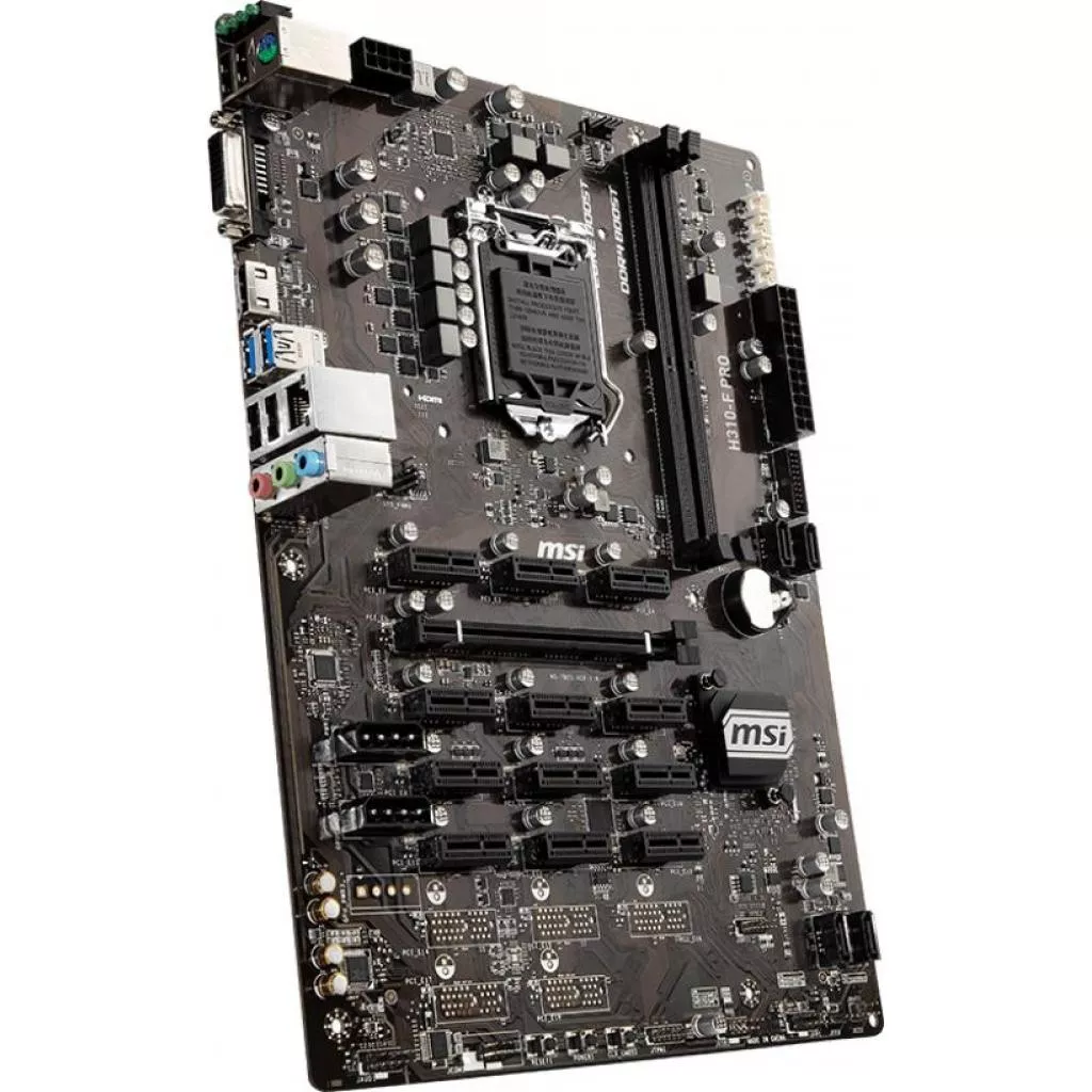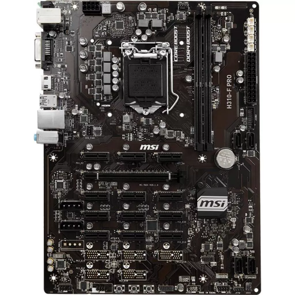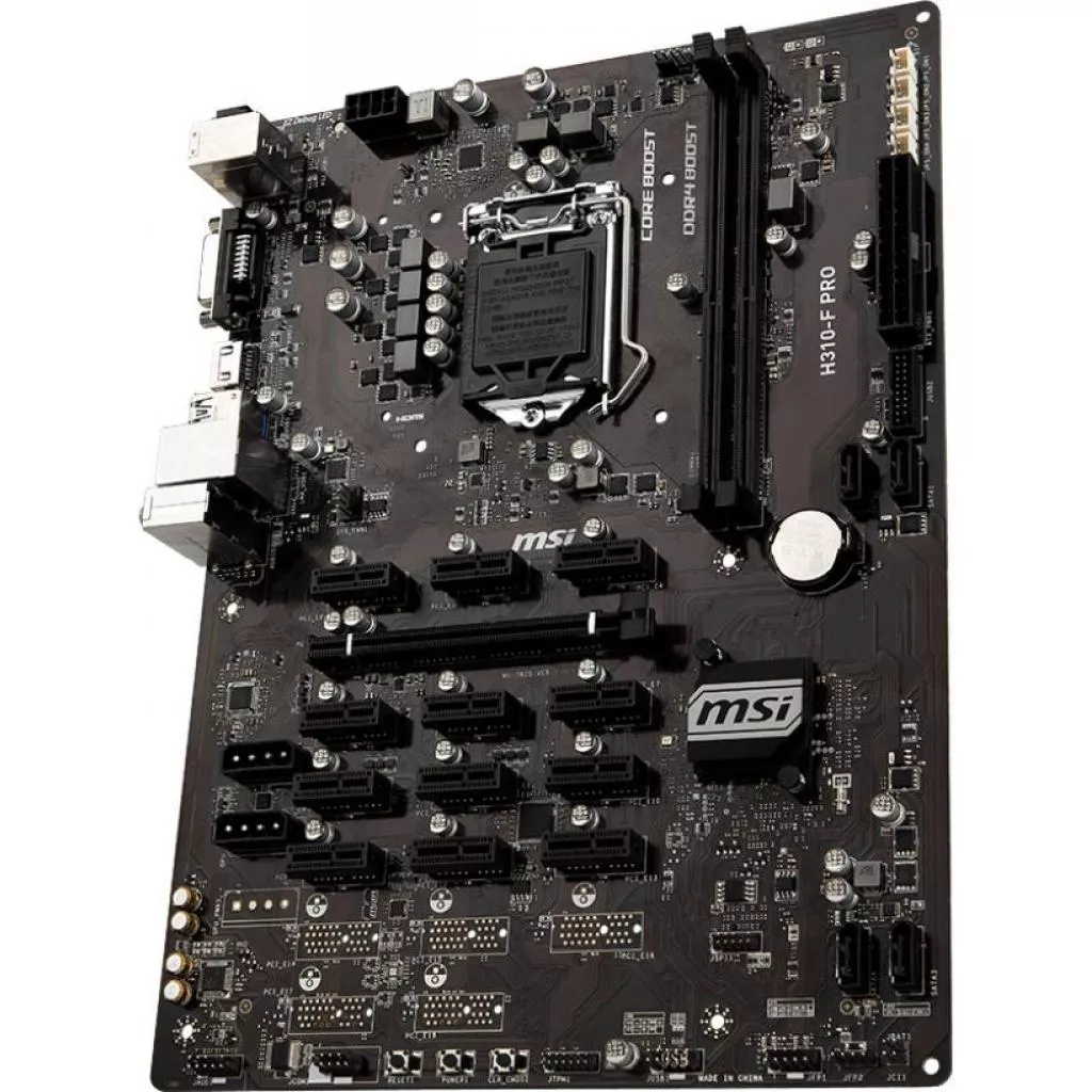 Материнская плата MSI H310-F PRO разработана специально для добычи криптовалют и поэтому поддерживает установку до 13 видеокарт одновременно. Чтобы обеспечить их питанием, на ней имеется 2 отдельных Molex-разъема и пять 24-конт. разъемов для источников питания.