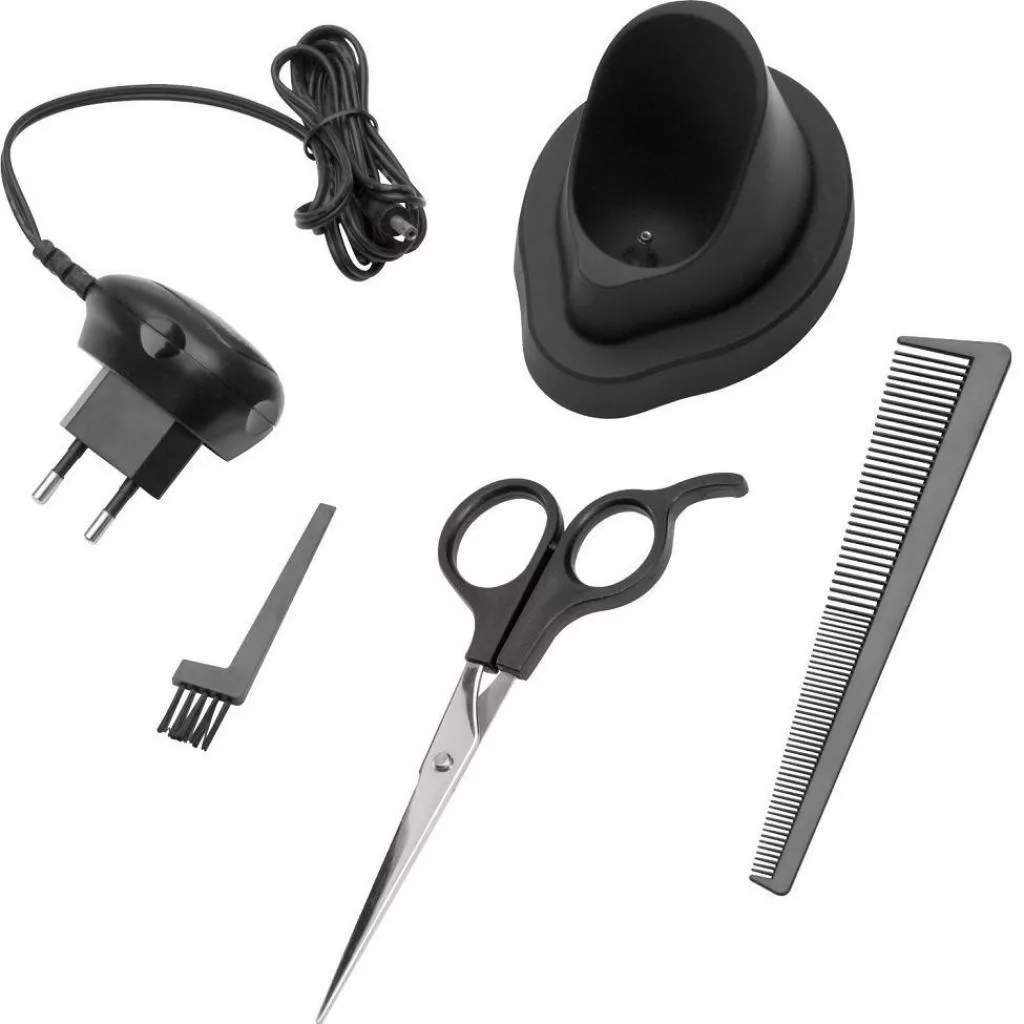 - Шесть принадлежностей: станция подзарядки/подставка, зарядное устройство от сети, расческа, щетка для очищения, ножницы, приспособление для расчески.