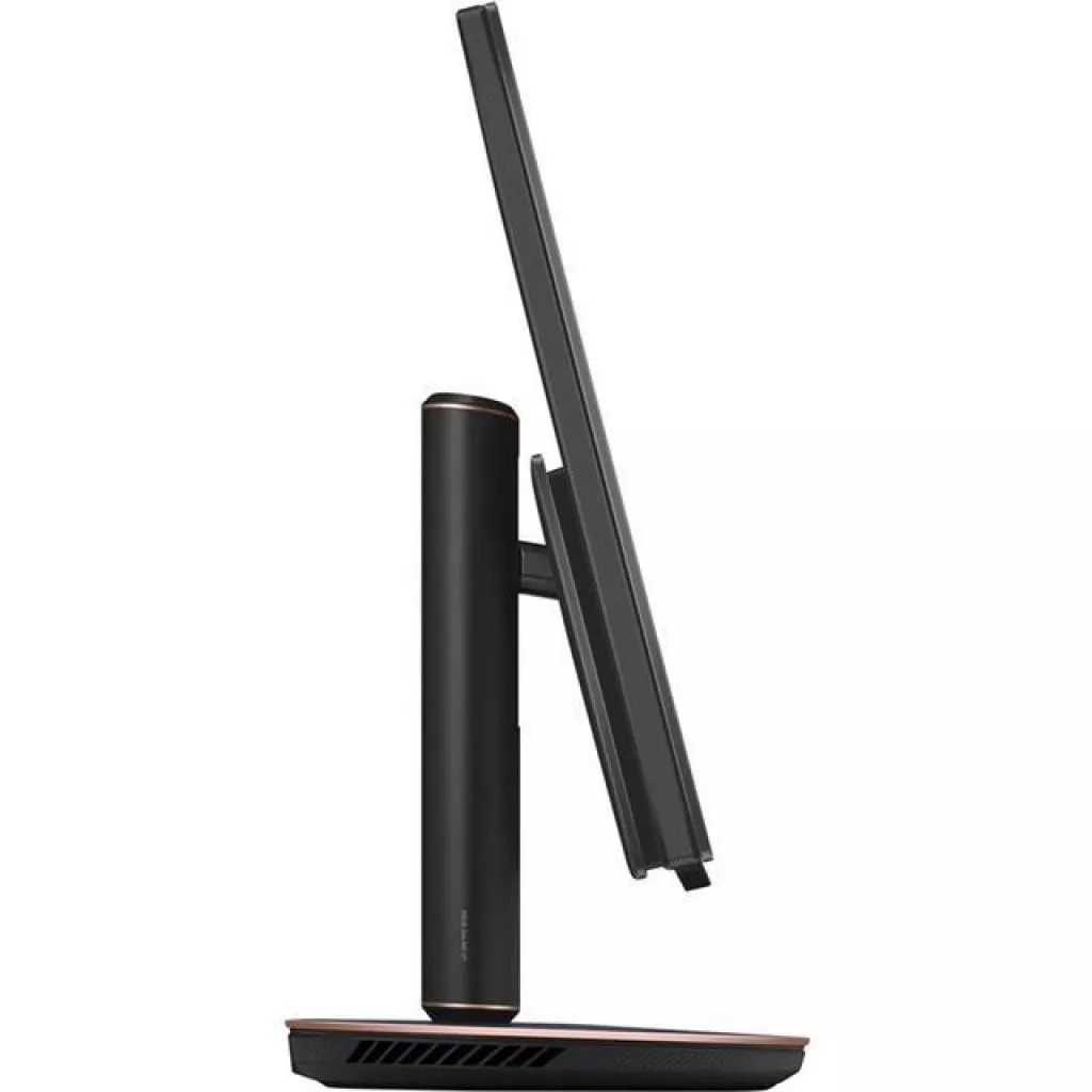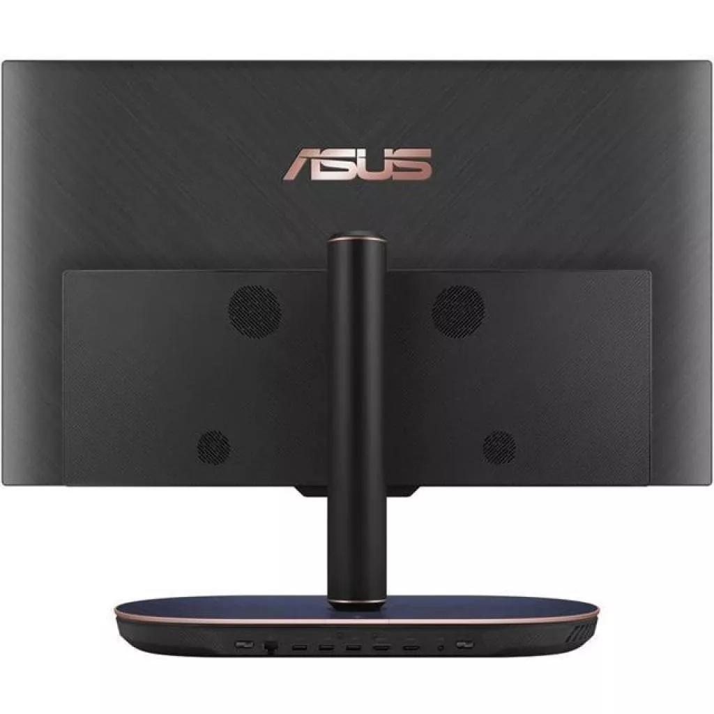 Zen AiO 27 Z272SD – это по-настоящему красивое устройство: цельный корпус с темно-синей отделкой, напоминающей текстуру шлифованного металла, идеально сочетается с прочной встроенной подставкой, на основании которой выделяется контрастная окантовка цвета розового золота. Именно в основании подставки размещены все системные компоненты, поэтому дисплей моноблока отличается удивительной тонкостью.