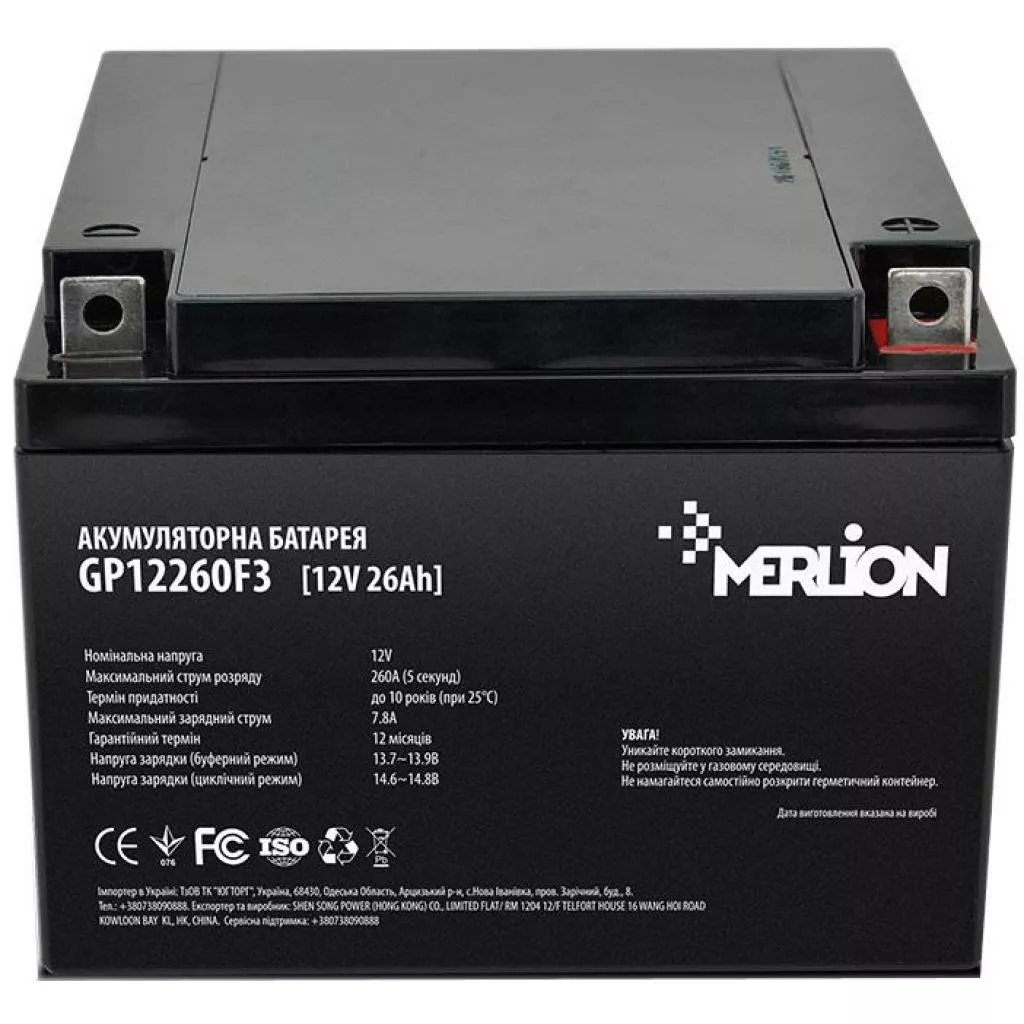 Батарея к ИБП Merlion 12V-26Ah (GP1226F3): герметичная конструкция; необслуживаемая: не требует ухода и способна работать в любом положении; отсутствие эффекта памяти после использования или повторяющихся разрядов; низкий саморазряд; широкий диапазон рабочих температур; емкость 26 А*ч.