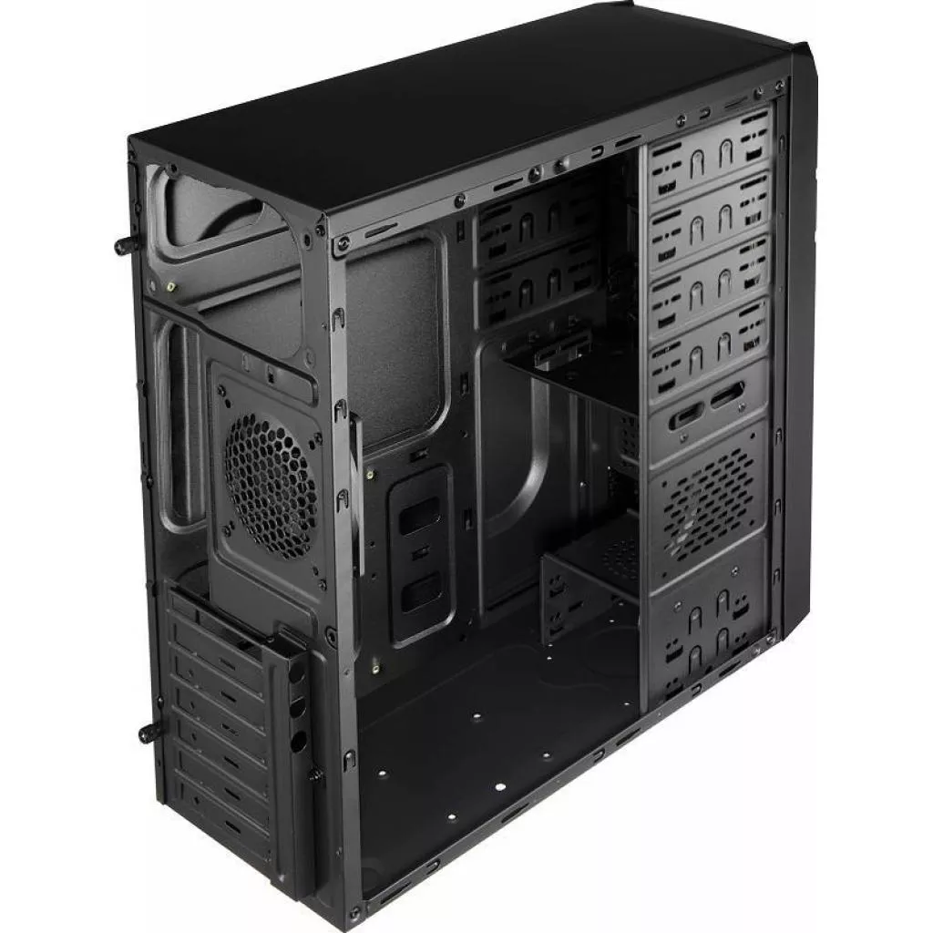 Нагретый компонентами воздух будет выдувать 92-миллиметровый предустановленный вентилятор, вращающийся со скоростью 1500 об/мин, расположенный на задней панели. Присутствует возможность установить дополнительные вентиляторы на передней и боковой частях корпуса. В корпусе помещаются процессорные кулеры высотой до 150 мм. Поддерживаются блоки питания любой стандартной длины и карты расширения длиной до 320 мм, под которые предусмотрено 7 слотов. Укомплектован блоком питания AeroCool VХ-550.