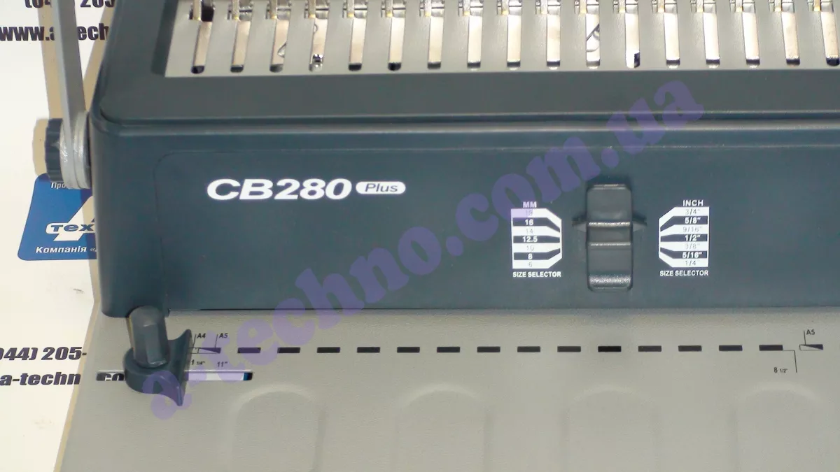 Биндер, брошюровщик bindMark СB280. Вид переплета пластиковой пружиной. Шаг перфорации 9*16 (21 отверстие). Способ перфорации ручная, горизонтальная. Форма отверстий прямоугольная. Ширина перфорации А4. Максимальное количество листов перфорации 20 листов. Максимальная толщина документа 450 листов. Максимальный диаметр пружины 51 мм. Возможность отключения ножей нет. Регулировка отступа перфорации от края листа 4 положения. Фиксатор разжима пружины нет. Селектор измерения пружины есть. Стопор позиционирования листа есть. Корпус металлический.