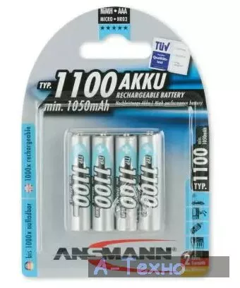 Аккумуляторная батарея Ansmann AAA 1100mAh * 4 (5035232) - этот Ni-MH аккумулятор высокой ёмкости (1100 мА*ч) разработан для профессионального использования и соответствует самым высоким требованиям. Допускает ультрабыстрый заряд и обеспечивает длительную службу.