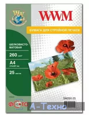 Бумага WWM A4 (SM260.25)- прекрасная высококачественная шелковисто-матовая бумага для полупрофессиональных и профессиональных фотоснимков, высококачественной печати пейзажей и художественных репродукций, длительная передача и сохранение цвета. Для водорастворимых и пигментных чернил.
