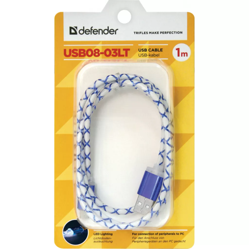 Дата кабель Defender USB08-03LT USB - Micro USB, BlueLED backlight, 1m - это кабель-переходник, предназначенный для соединения современных мобильных устройств с компьютером с целью передачи данных или подзарядки, а также для зарядки от источников питания, снабжённых портом USB. Кабель-переходник обеспечивает высокоскоростную передачу данных в стандарте USB 2.0 со скоростью до 480 Мб.сек.