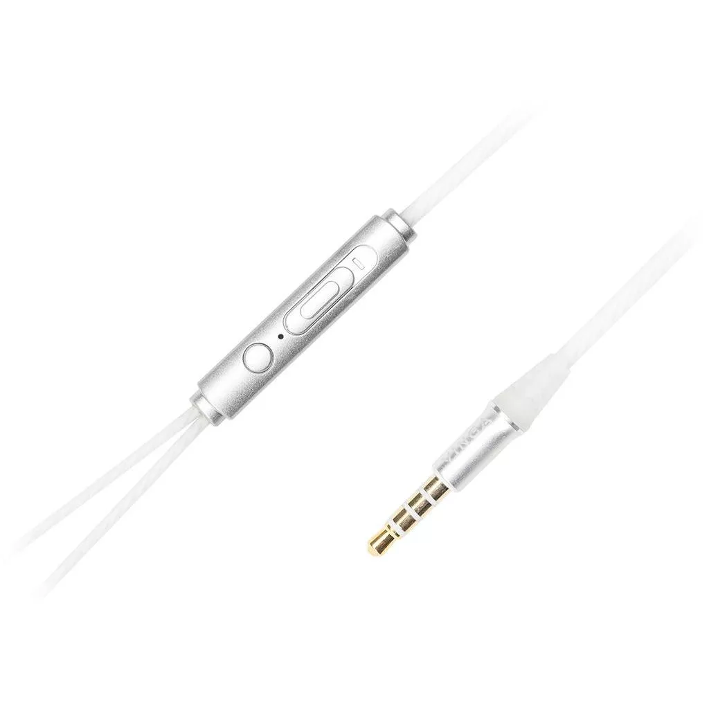 Подключение EPM050 Silver к проигрывателям, смартфонам и ПК осуществляется посредством 120-сантиметрового кабеля, оборудованного выходом диаметром 3.5 мм с 4 контактами. Проводка размещена в упрочненном кожухе. Поскольку это не просто наушники, а полнофункциональная гарнитура, в ней имеется микрофон. Звукоприемник отличается довольно высокой чувствительностью — до 43 дБ.