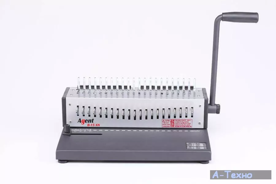 Брошюровщик Agent B-15 KN. Упаковка пружин в Подарок. Мощность перфорации (листов) 15. Толщина переплета (листов) до 380. Регулировка глубины перфорации (мм) 3-6. Регулировка раскрытия пружины нету. Возможность отключения ножей все. Ручки перфорации и переплета 1 Вес (кг) 6, 15. Габариты (мм) 380x260x120.