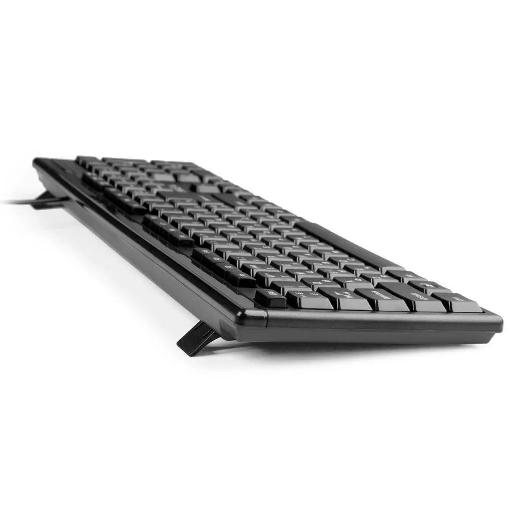 KB320BK — упрочненный вариант стандартной клавиатуры от Vinga. Это устройство весит 440 г, поскольку в его конструкции использовано чуть больше пластика, чем в предыдущей модели. Нижняя панель оснащена двумя опорными элементами, которые можно откидывать или прятать, когда понадобится. Чтобы привести их в рабочее положение или наоборот, спрятать в корпусе, понадобится произвести всего одно предельно простое движение.