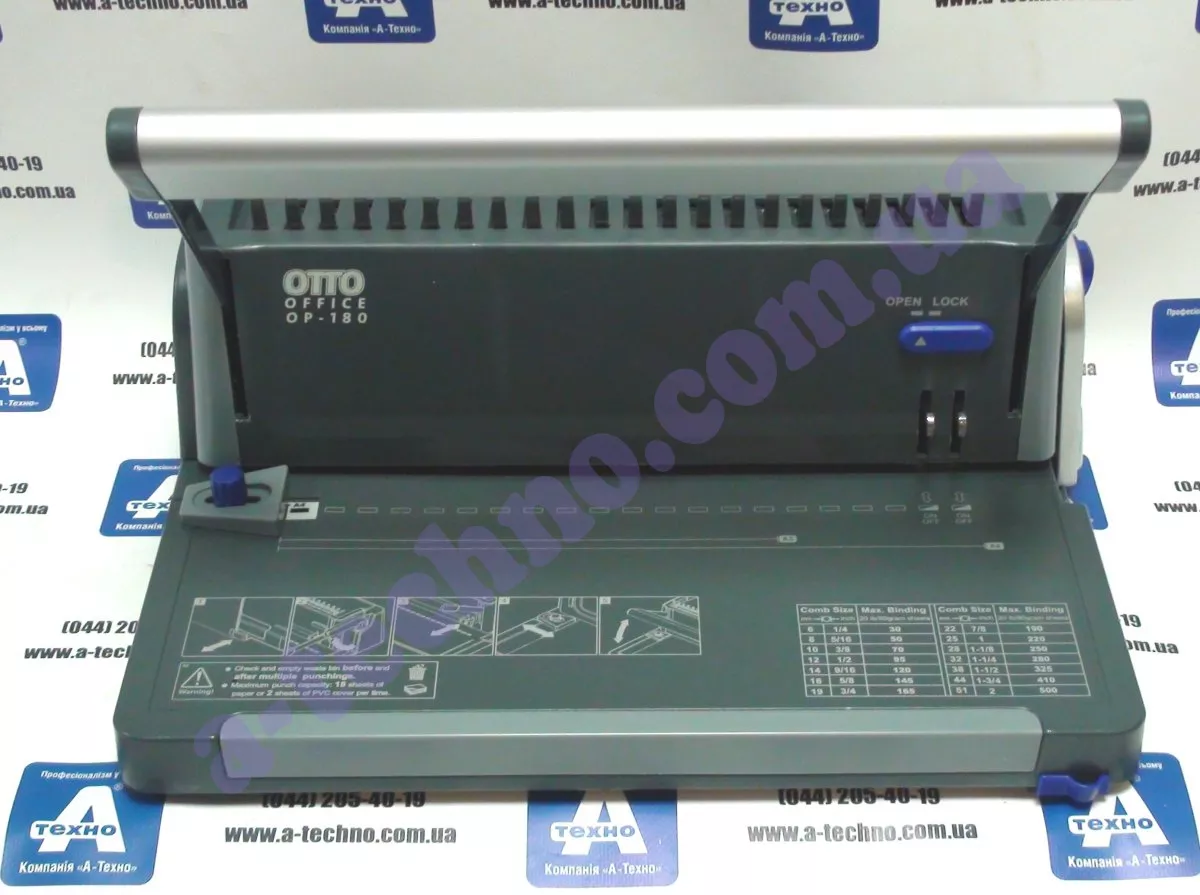 Биндер, брошюровщик Agent OP 180. Тип перфорации Механический. Мощность перфорации, листов 20. Максимальная толщина переплета, листов 450. Регулировка глубины перфорации Да. Регулировка раскрытия пружины Нет. Возможность отключения ножей Да. Ручки перфорации и переплета 2. Вес, кг 5. Габариты, мм 395x325x185.