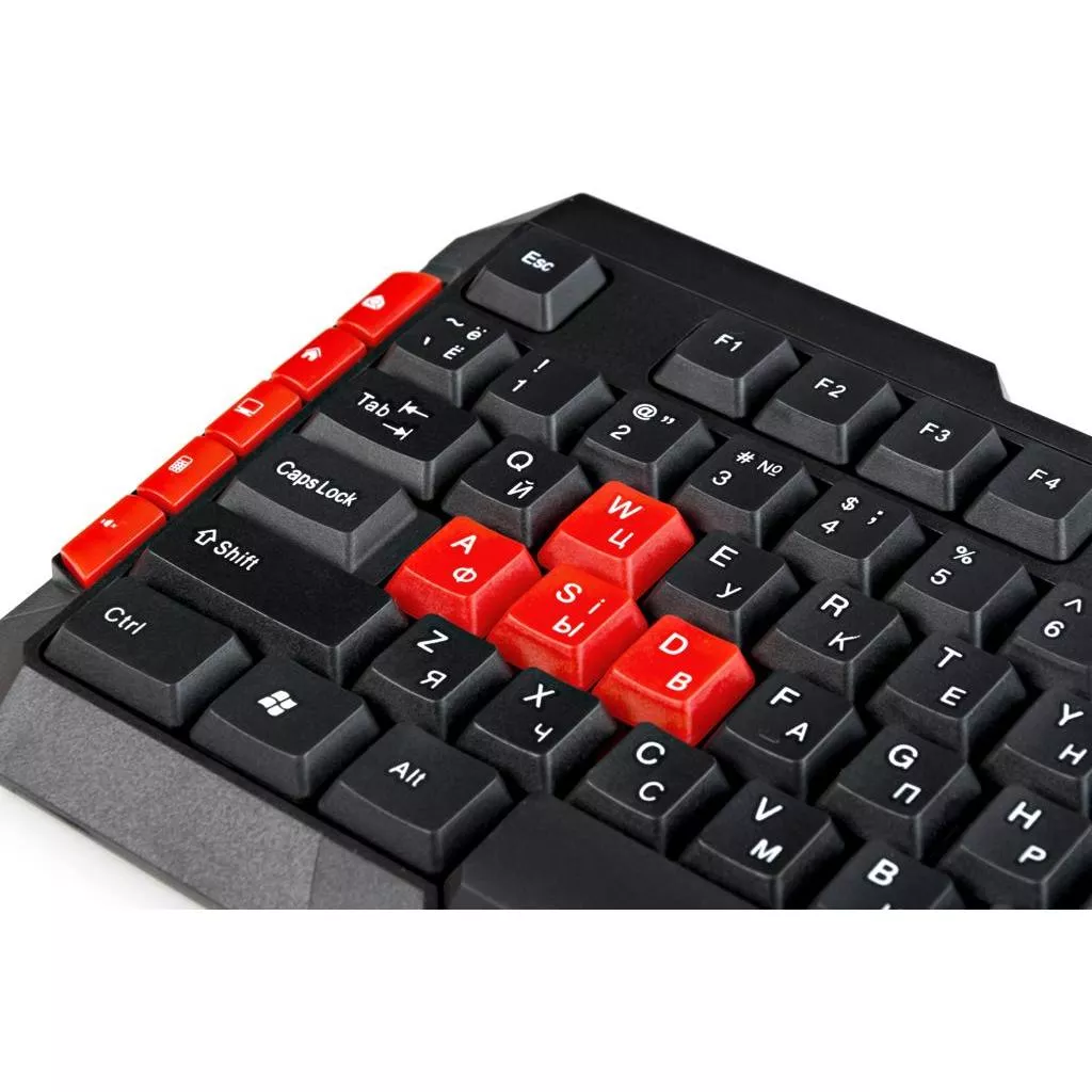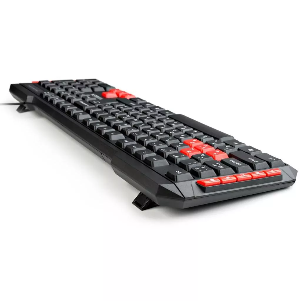 KBG120 отличается довольно крупными кнопками, высоко выступающими над фронтальной панелью. Эта особенность делает клавиатуру предельно удобной в эксплуатации, ведь вы без труда нащупаете нужные клавиши, не глядя на них, а затем совершите нажатие, не цепляя при этом случайно соседние детали. Функционал устройства состоит из 102 основных компонентов ввода и 10 дополнительных, которые расположены у левого и правого краев корпуса. Бонусные кнопки и стандартные элементы управления движением (стрелки, A, W, D, S) выполнены из красного пластика, а остальные — из черного.