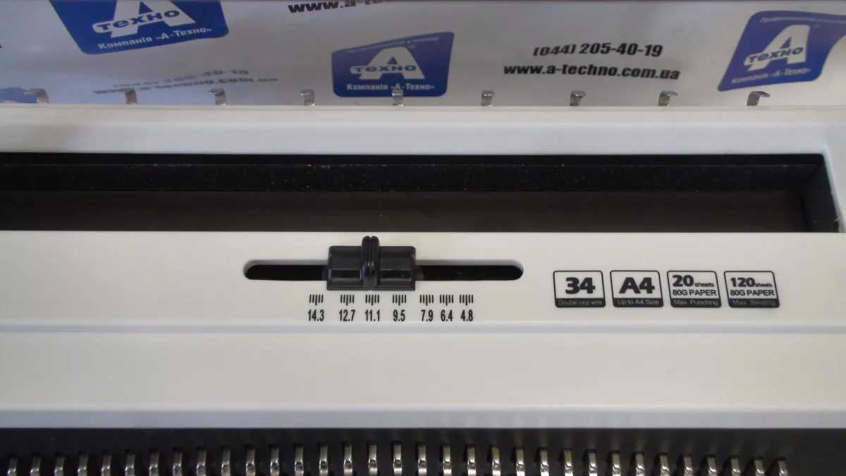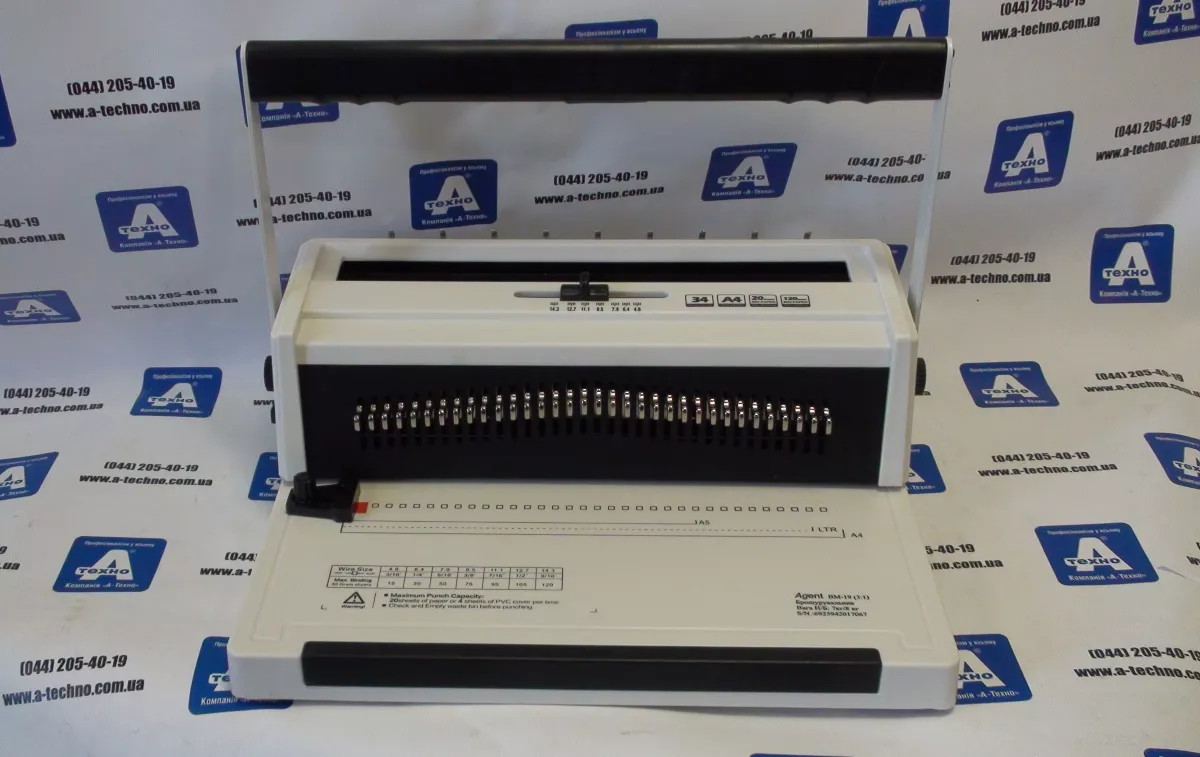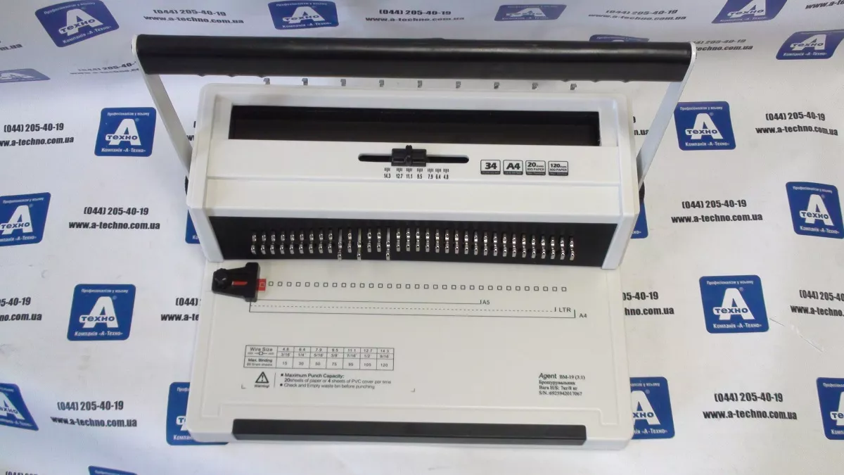 Биндер Agent BM-20-2w (3:1). Тип перфорации – механический. Шаг перфорации 3:1. Ограничение по формату Да. Рабочая ширина 320 мм. Мощность перфорации 20 листов. Максимальная толщина брошюровки 120 листов. Регулировка глубины перфорации Да. Возможность отключения ножей Да. Форма отверстий квадратная. Ручки перфорации и брошюровки 2. Вес нетто 11.5 кг. Габариты товара 450x270x180 мм.