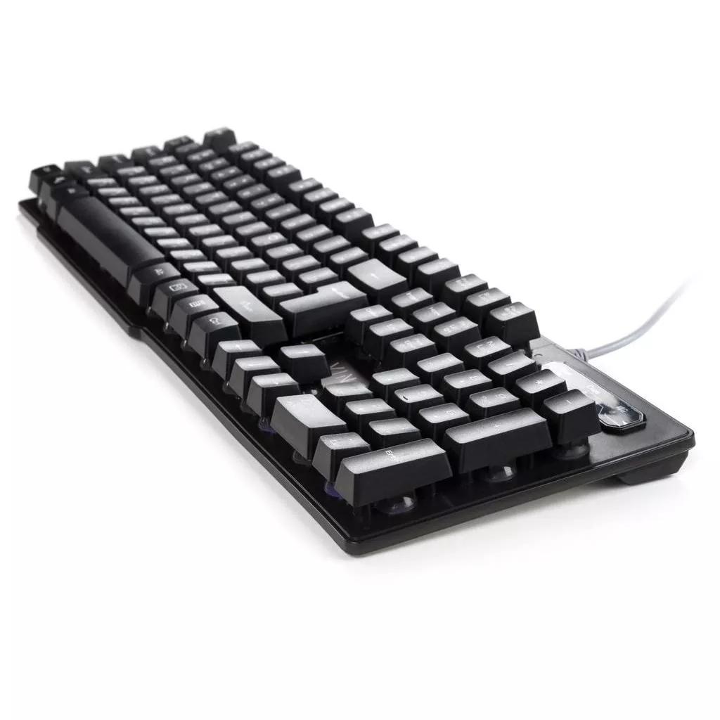 Это средство ввода является достаточно массивным и весит 807 грамм, зато им очень удобно пользоваться. Функционал изделия поддерживает 3 языковых раскладки. На кнопках изображены украинские, английские и российские буквы. Всего в модели 104 клавиши, среди которых есть полный ряд F1 — F12 и калькуляционный комплекс NumPad. Сам корпус выполнен из прозрачных пластиковых панелей, но все кнопки на нем — черные. При включении подсветки такой дизайн выглядит празднично.