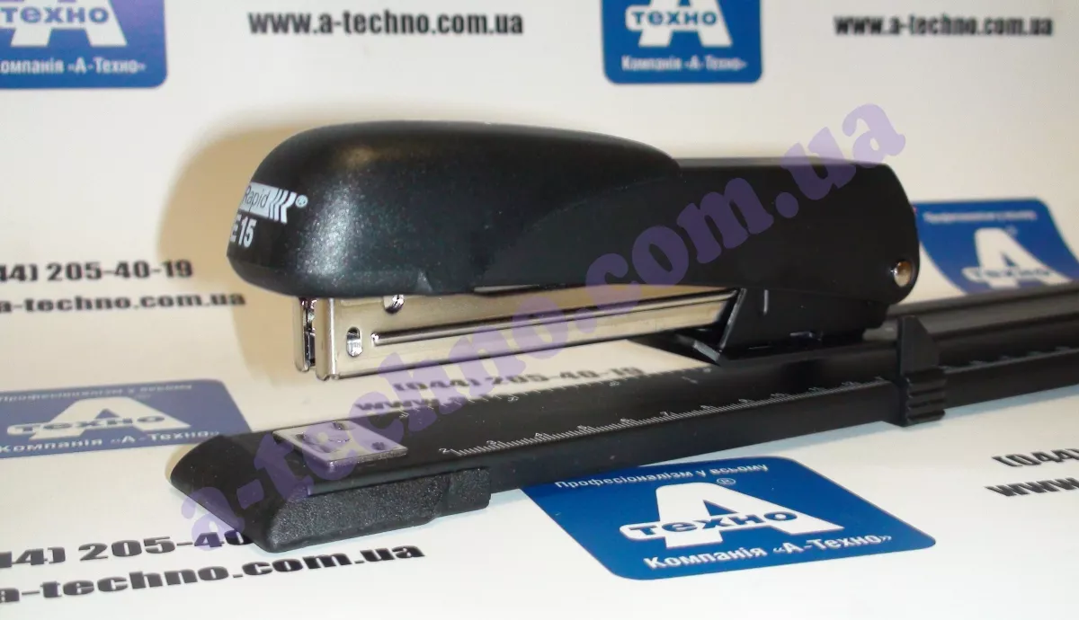 Степлер RAPID E15. Мощный степлер с " длинным плечем" , что позволяет без особых проблем переплести формат А3 пополам. Характеристики глубина отступа до 320 мм. Толщина скрепления до 20 листов. Использует скобы 24/6, 26/6.