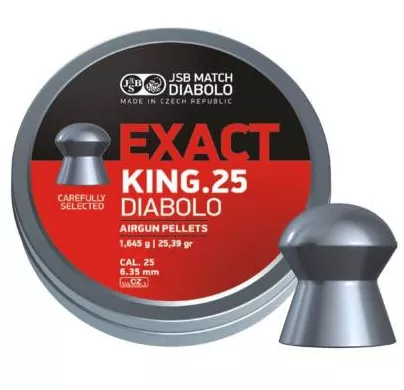 Серия Diabolo Exact - эталон качества для спортивной или развлекательной стрельбы по полевым мишеням до 50 м, а также для охотничьей стрельбы на экстремально дальние расстояния (до 200 м). Diabolo Exact King - первая модель в калибре 6,35. Вес пули находится в среднем диапазоне позволяет использовать ее для большей части пневматических винтовок в этом калибре. Начальная скорость при мощности 16 Дж составляет 175 м/с, при мощности 50 Дж - 250 м/с, и 295 м/с при мощности 70 Дж.