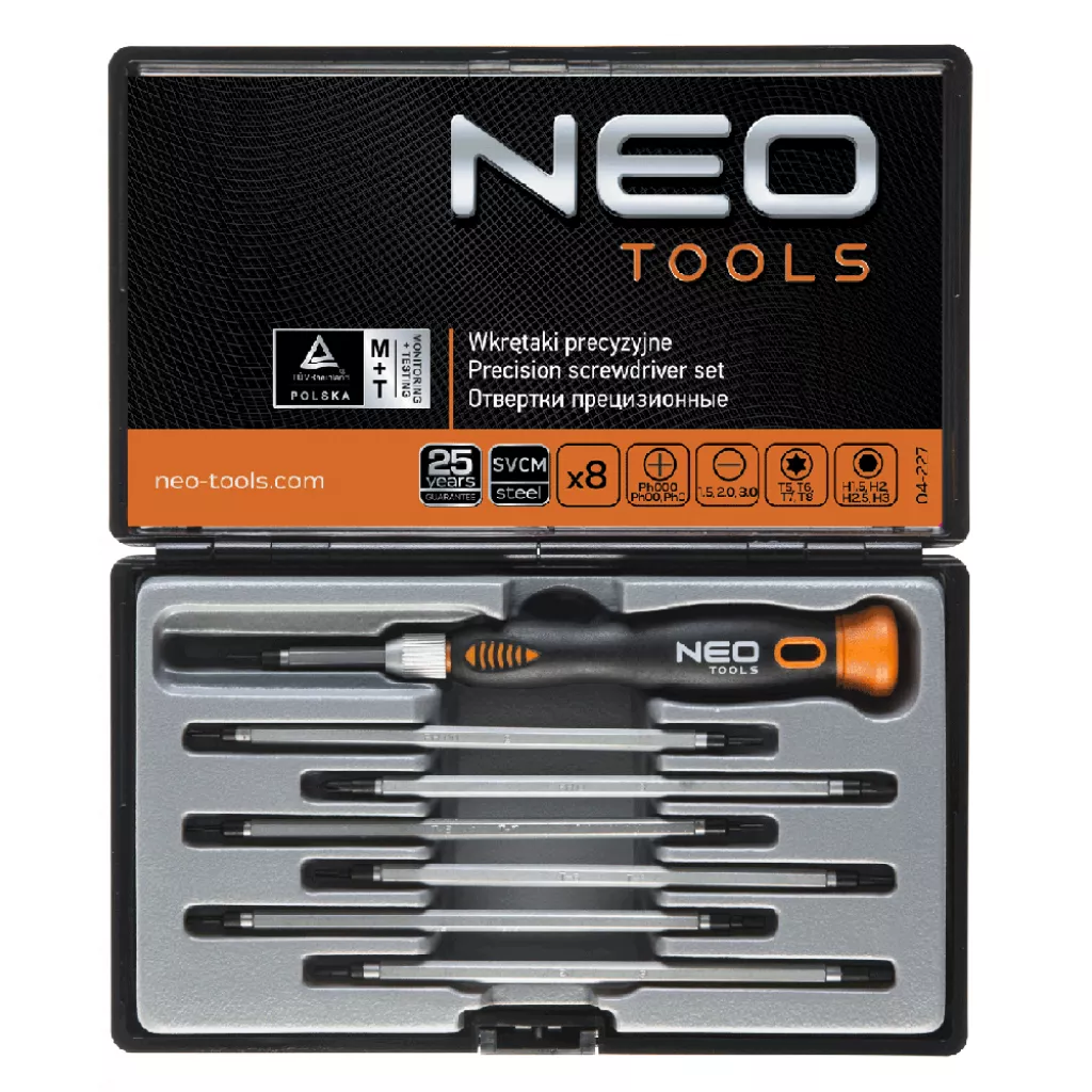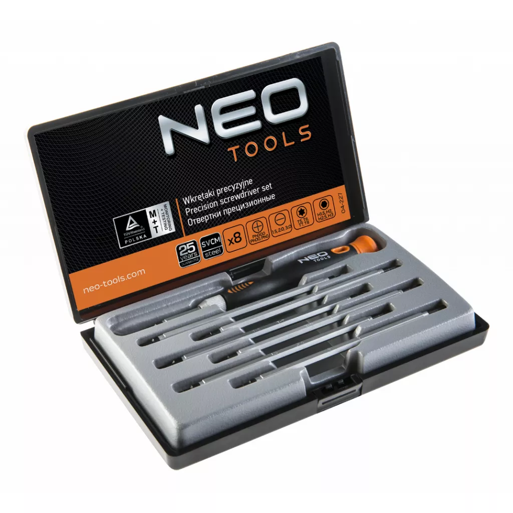 Набор прецизионных отверток NEO - в наборе рукоятка и 7 двухсторонних насадок 120 мм (шлицевых, крестовых, Torx и шестигранных).