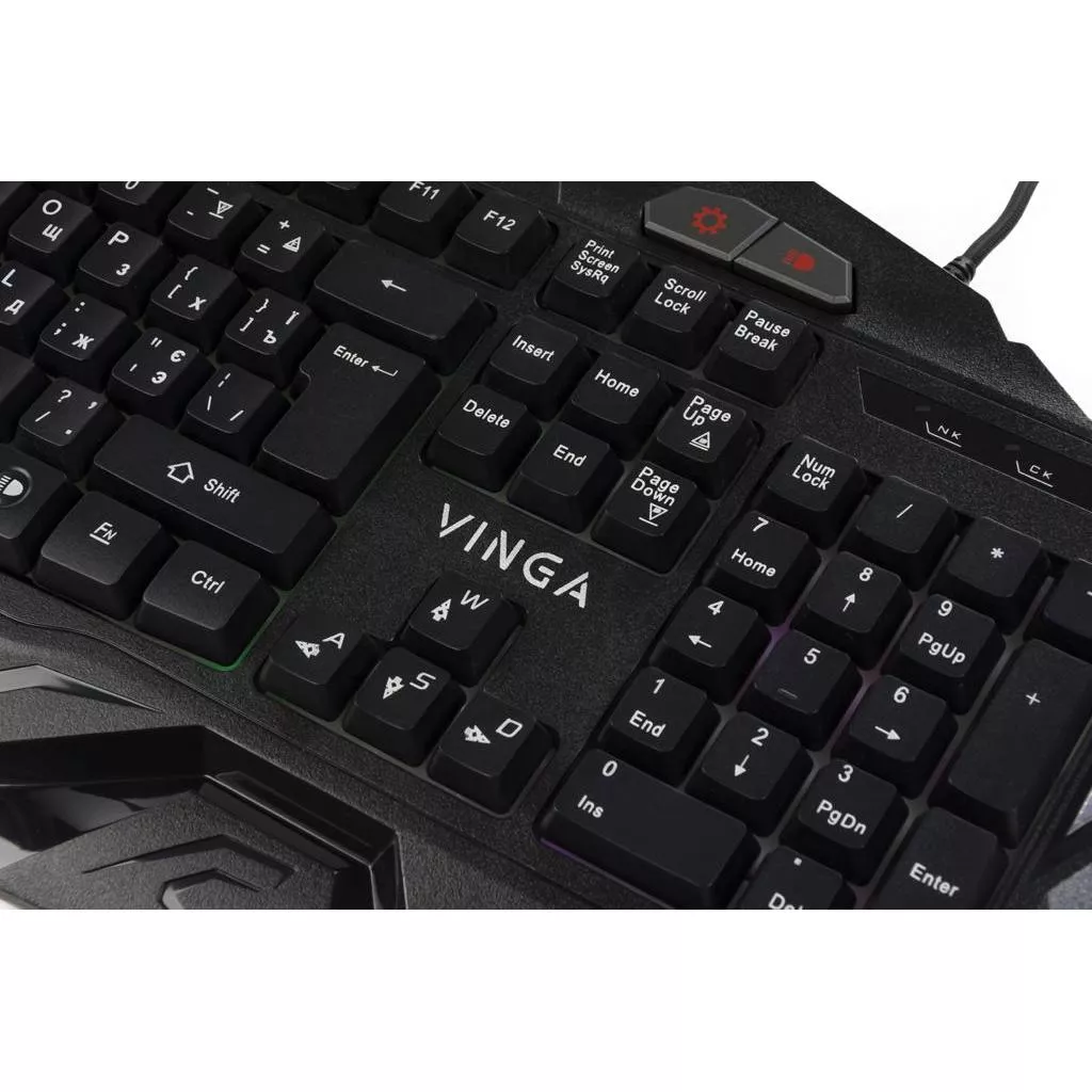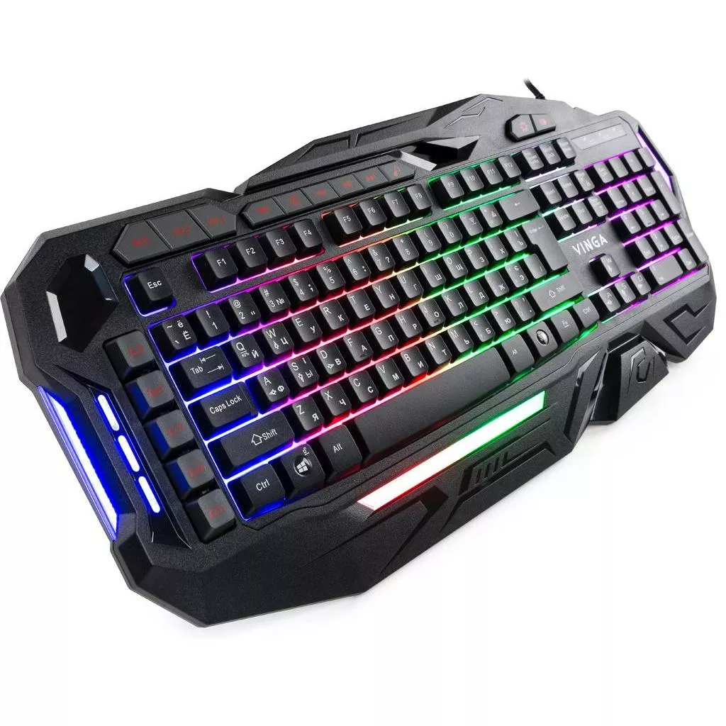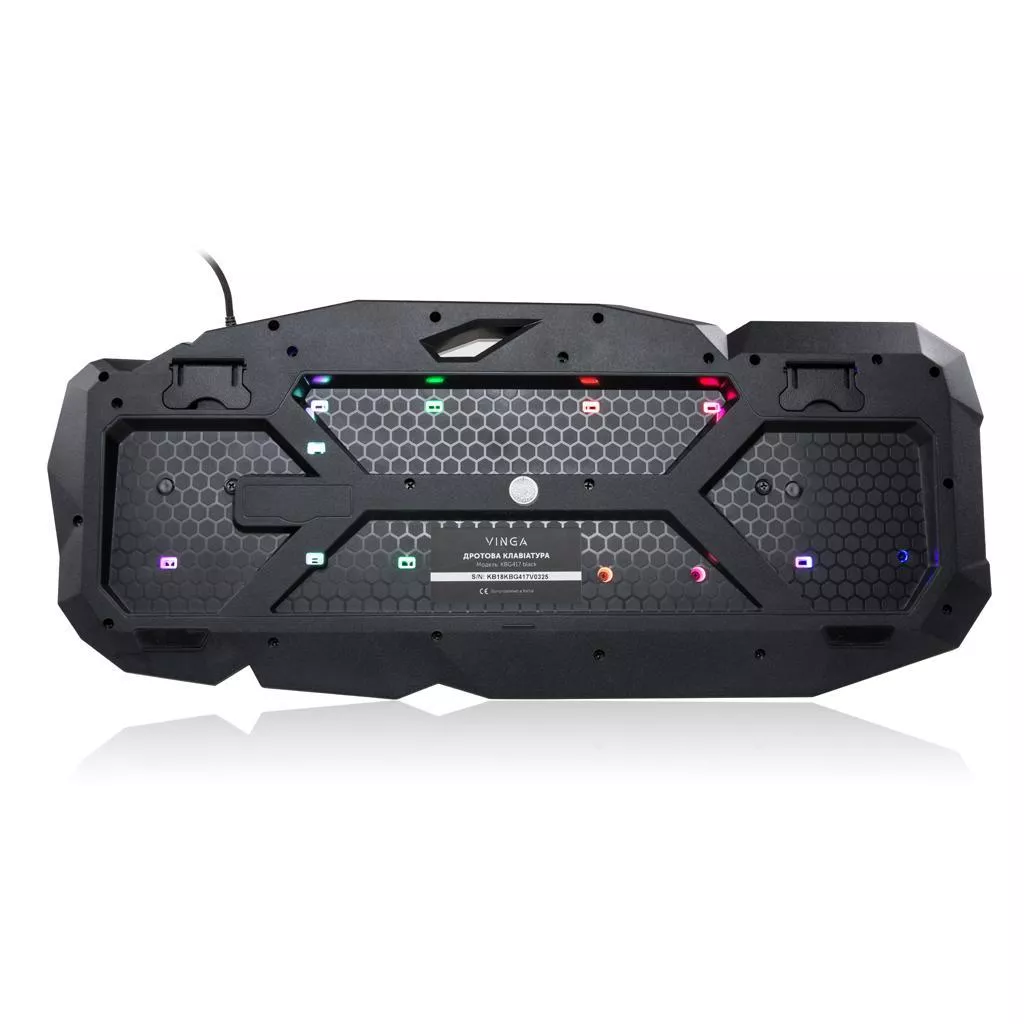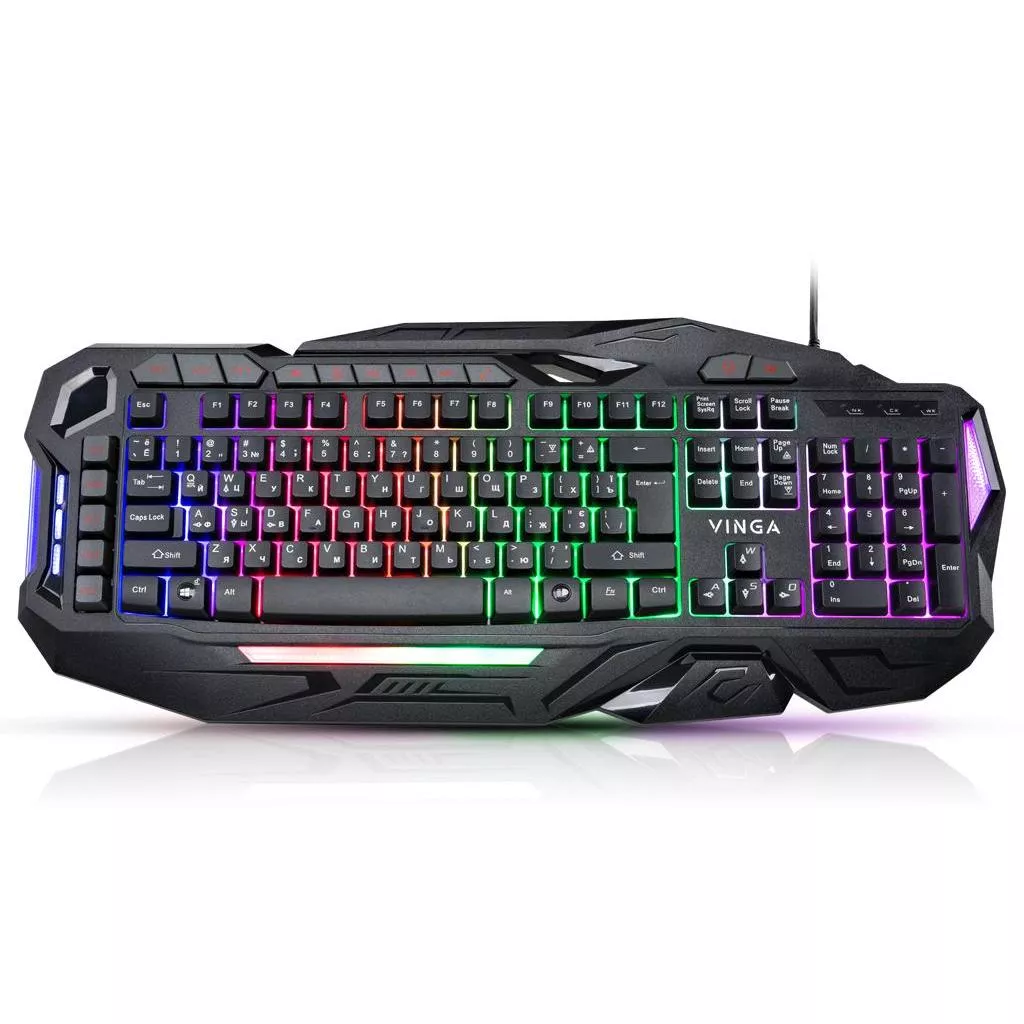 Vinga KBG417 black — игровая клавиатура, предназначенная специально для требовательных геймеров и киберспортсменов. Модель имеет футуристический дизайн: его характерные черты часто можно увидеть во многих современных играх. Между клавишами размещены прозрачные участки, сквозь которые пробивается разноцветное свечение от ламп подсветки. Кнопки относительно высоко выступают над корпусом и находятся на довольно большом расстоянии друг от друга. Это сделано специально для удобства пользователя: вы можете печатать «не глядя», интуитивно попадая пальцами на нужные участки клавиатуры и не цепляя соседние.