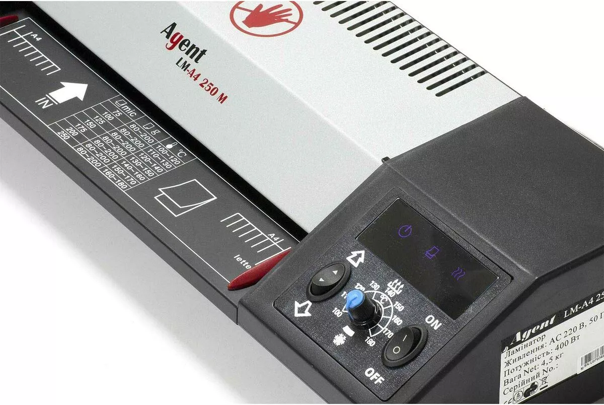 Ламинатор конвертный Agent LM-A4 250 M . Пачка пленки в Подарок. Формат А4. Макс. ширина ламинирования (мм) 230. Температура нагрева валов (? С) 100 - 180. Скорость ламинирования (мм/мин) 450. Холодное ламинирование нет. Реверс есть. Фольгирование есть. Ламинирование фотографий есть. Макс. толщина пленки (мк) 250. Система обработки листов 4 вала. Корпус металл. Габариты (мм) 430x210x105.