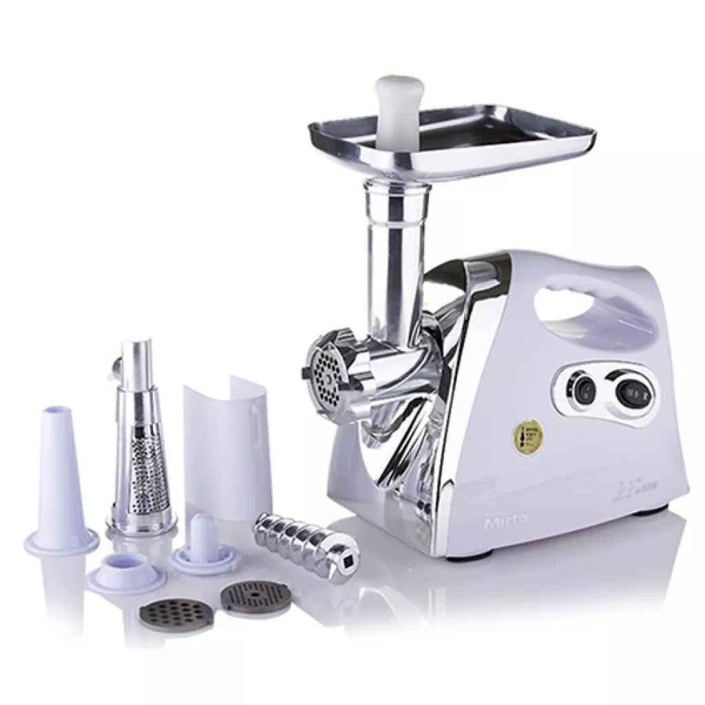 – функциональная и удобная электромясорубка для вашей кухни. Помимо привычного функционала в виде нарезки мяса, данная модель имеет возможность производства сока или пасты из мягких овощей и фруктов. Для этого в комплекте имеется специальная насадка. Чтобы получить фарш необходимой величины помола в есть перфорированные диски с отверстиями различного диаметра. Так же можно легко и быстро сделать колбаски или куббе с помощью соответствующих насадок в комплекте. Очистить шнек от остатков мяса и жил легко можно при помощи функции реверса, а защитить мотор от перегрева поможет специальная система безопасности.