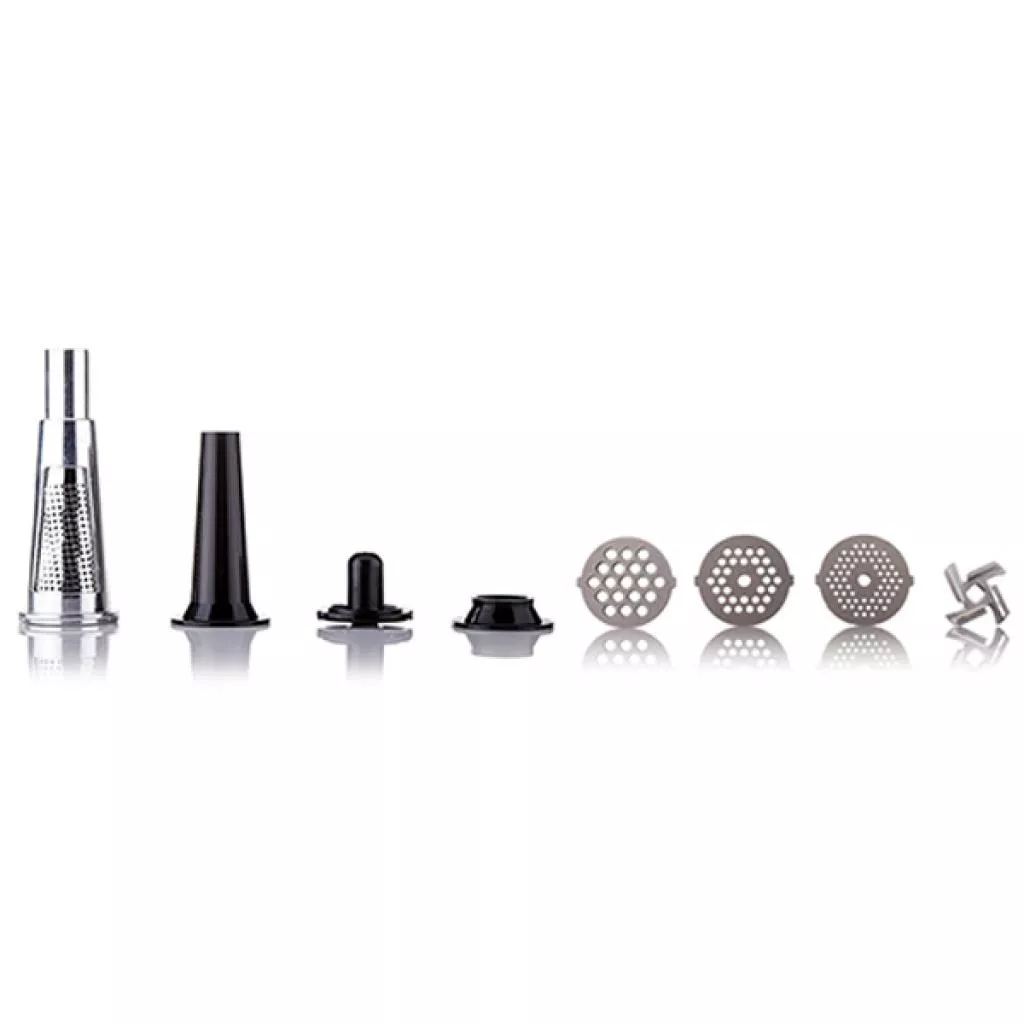 есть решетчатые диски с 3-х, 5-ти и 7-ми миллиметровыми отверстиями. Конечно же, в комплекте есть и насадка для домашних сосисок/колбасок и насадка «куббе» (кубе, или кебе – это такая насадка для котлетки с начинкой внутри).