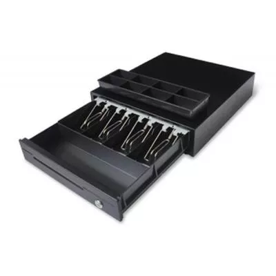 Бюджетный небольшой денежный ящик на 4 регулируемые секции для купюр с металлическими держателями и съемным лотком на 5 секций для монет. Замок 3-х позиционный: блокировка, электронное и ручное открытие. Корпус с металлической конструкцией. Идеальный ящик для розничных сетей, а также для больших ECR-платформ.