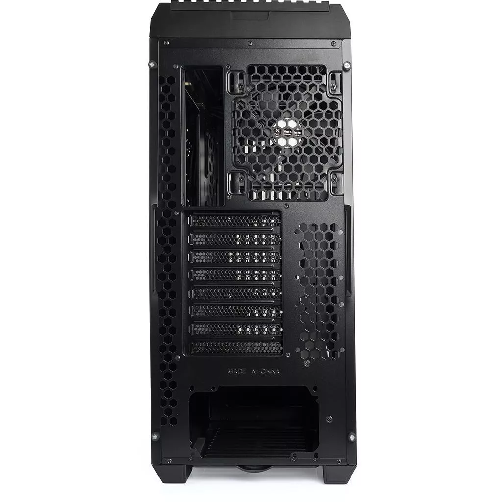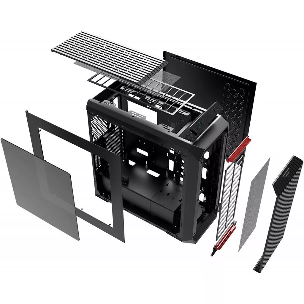 Дизайн модели впечатляет: матовые решетки на тыльной и фронтальной панелях, окаймленные черной пластмассовой рамой окошки на боковых сторонах, выполненные из пластика с красноватым оттенком – каждый штрих излучает завершенность, осмысленность. Сквозь полупрозрачные пластины стенок видны окружности ячеек, предназначенных под установку вентиляторов: в них вмонтированы декоративные неоновые лампы. Все это делает внешний вид корпуса элегантным, солидным, даже в некоторой степени благородным. Стенки конструкции изготовлены из пластика и листового металла толщиной 0.9 мм. Под размещение оборудования отведено 10 отсеков и 8 слотов расширения. Присутствуют 4 разъема USB и 1 для Audio.