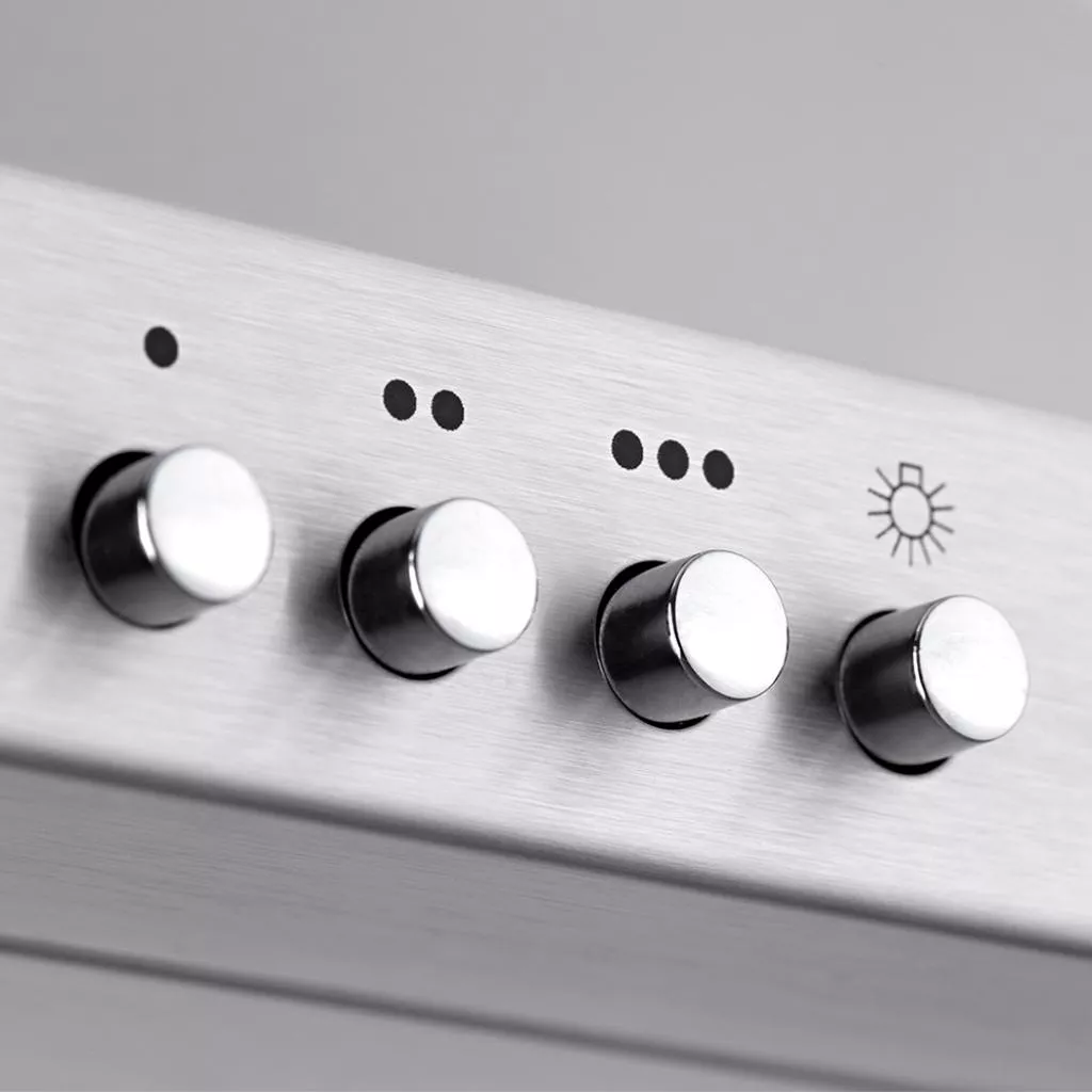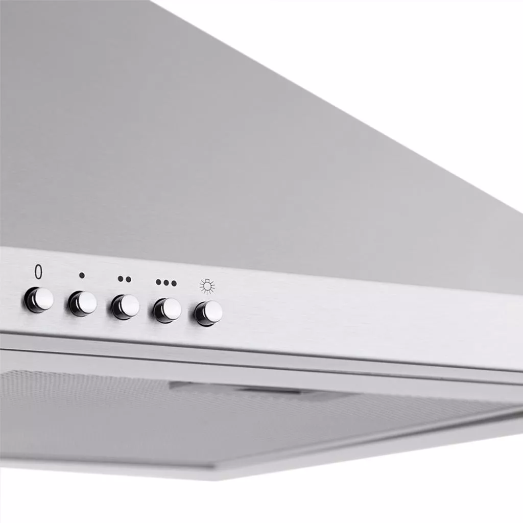 PYRAMIDA KH 60 inox – вытяжка настенного монтажа, имеет купольный тип. Управление механическое, при помощи кнопок, что расположены на панели в передней части вытяжки, вы легко можете выбрать необходимы режим, скорость или степень освещения. За час работы вытяжка может очистить до 700куб.м. воздуха. Учитывая такую производительность, уровень шума достаточно низок и составляет лишь 58 дБ, что не препятствует созданию уюта в вашей кухне. Вытяжка достаточно компактна, ее габариты составляют 59,8-94х60х49,9 см. Для качественного освещения в вытяжку встроены две лампы накаливания, по 40 Вт каждая. Вы тяжка работает в режимах рециркуляции и отвода. Их можно настроить на одну из трех представленных скоростей при помощи кнопочной панели. Модель имеет пятислойный жировой фильтр из алюминия, который качественно очищает воздух в кухне, не оставляя неприятные запахи или же копоть. В режиме рециркуляции вы можете использовать специальные угольные фильтры. Они продаются в сервисных центрах и торговых точках.