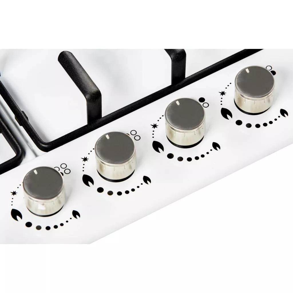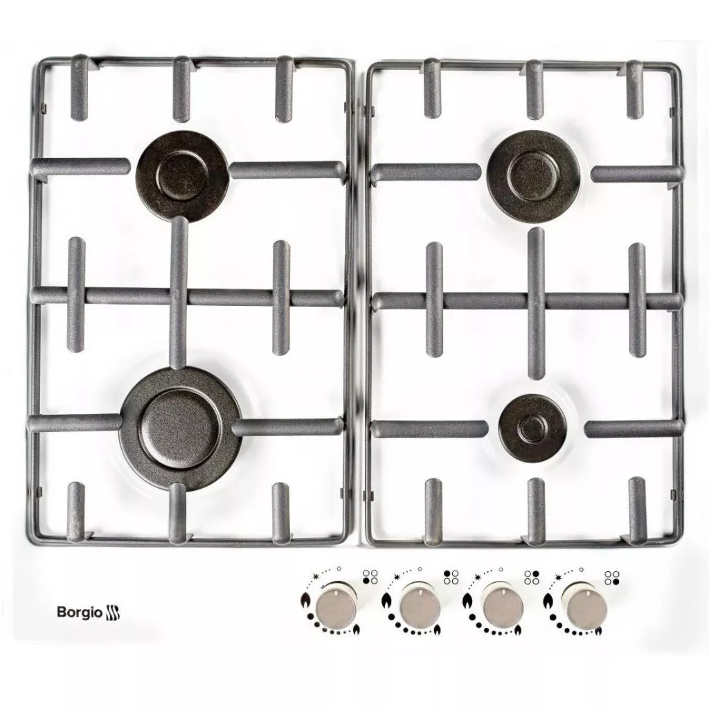 Варочная поверхность Borgio 6621 (White Enamelled) имеет традиционное, фронтальное расположение ручек управления, при нажиме которых активизируется система автоподжига, благодаря наличию возле каждой из 4 конфорок пьезоэлемента.